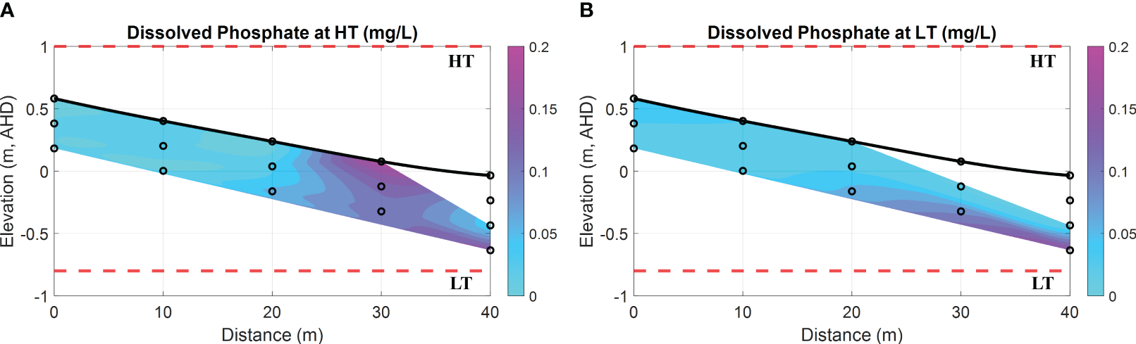Spatial distribution of dissolved phosphate (PO43–) at HT and LT in the intertidal area. (A) dissolved PO43– (in mg/L) at HT; (B) dissolved PO43– (in mg/L) at LT. In addition, the bold black line is the beach profile, and the black circles represent the sampling points. The red dashed lines represent the HT and LT elevations in relation to the Australian Height Datum (AHD) which is the official vertical datum for Australia. The horizontal represents the distance towards the ocean, and the vertical represents the elevation relative to AHD.