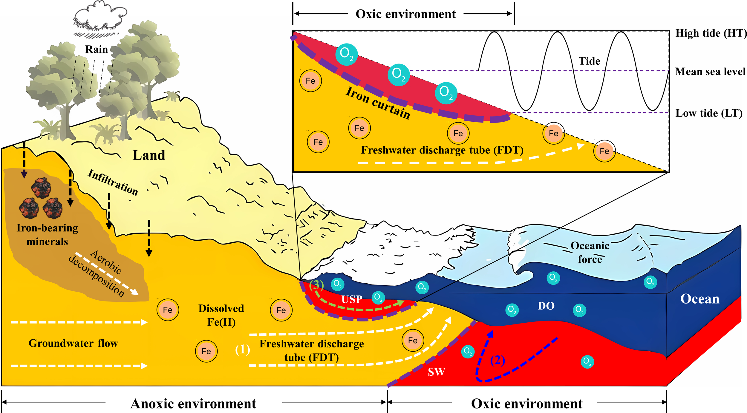 A comprehensive field investigation demonstrated a geochemical transition from groundwater to seawater in the intertidal area. This area was characterized by the tide-induced circulating seawater and the discharge of fresh groundwater beneath. The dynamic process of groundwater-seawater mixing created a USP, a highly reactive zone that determined the speciation and solubility of Fe transporting through the FDT. Consequently, a substantial increase in DO concentration was observed, which created a localized hotspot with increased Eh. This indicated an oxidizing environment for Fe(II)-rich groundwater beneath and led to the oxidative precipitation of Fe(II) at the groundwater-seawater interface. Therefore, the sediment analysis revealed a spatial distribution of precipitated Fe with a strip-like pattern along this interface from land to the ocean. These regions with intensive accumulation of Fe oxides can be referred to as the iron curtain, acting as a geochemical barrier to retain dissolved phosphate by changing the seepage properties of coastal sediment. The field results indicated that the characterization of pH, DO, Eh and PO43– profiles can be utilized as a practical approach to investigating and positioning the presence of iron curtains in the coastal area.