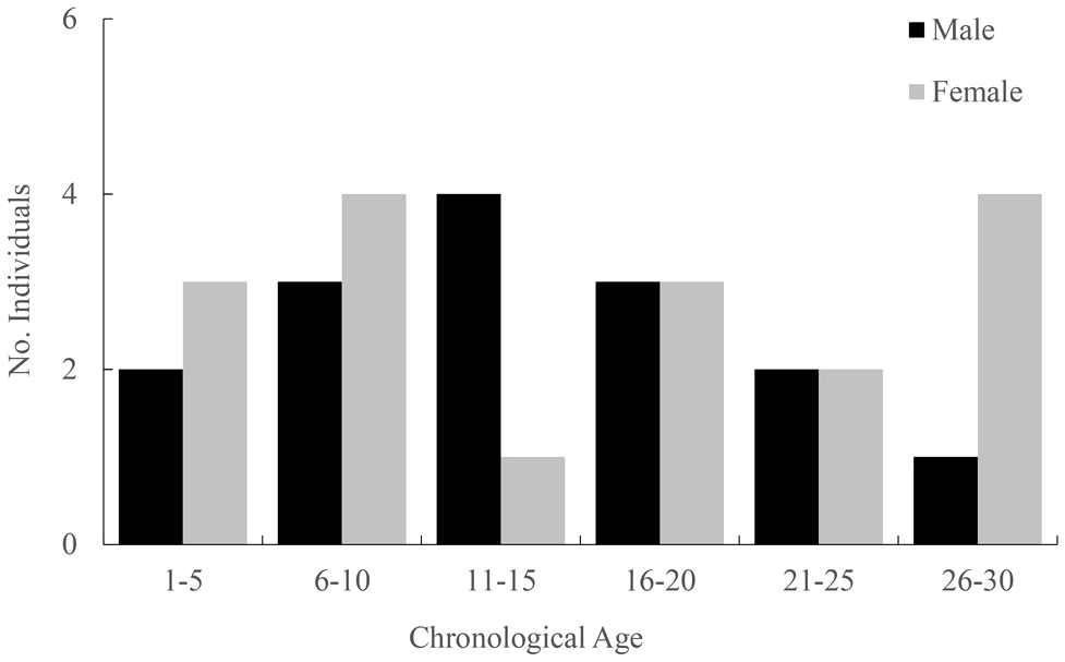 Chronological age distribution of male and female samples. Their ages were estimated based on growth layer groups (GLGs) in teeth.