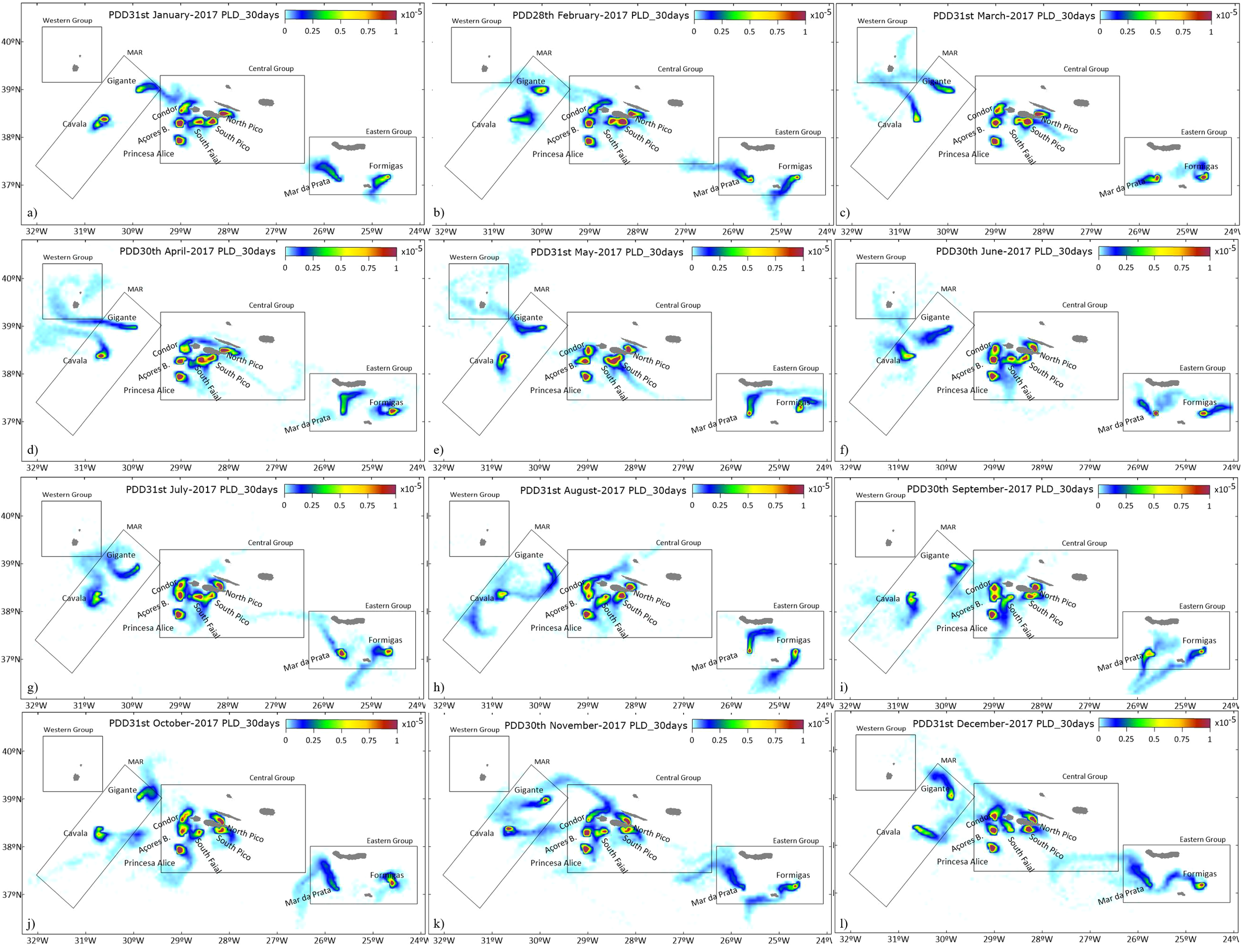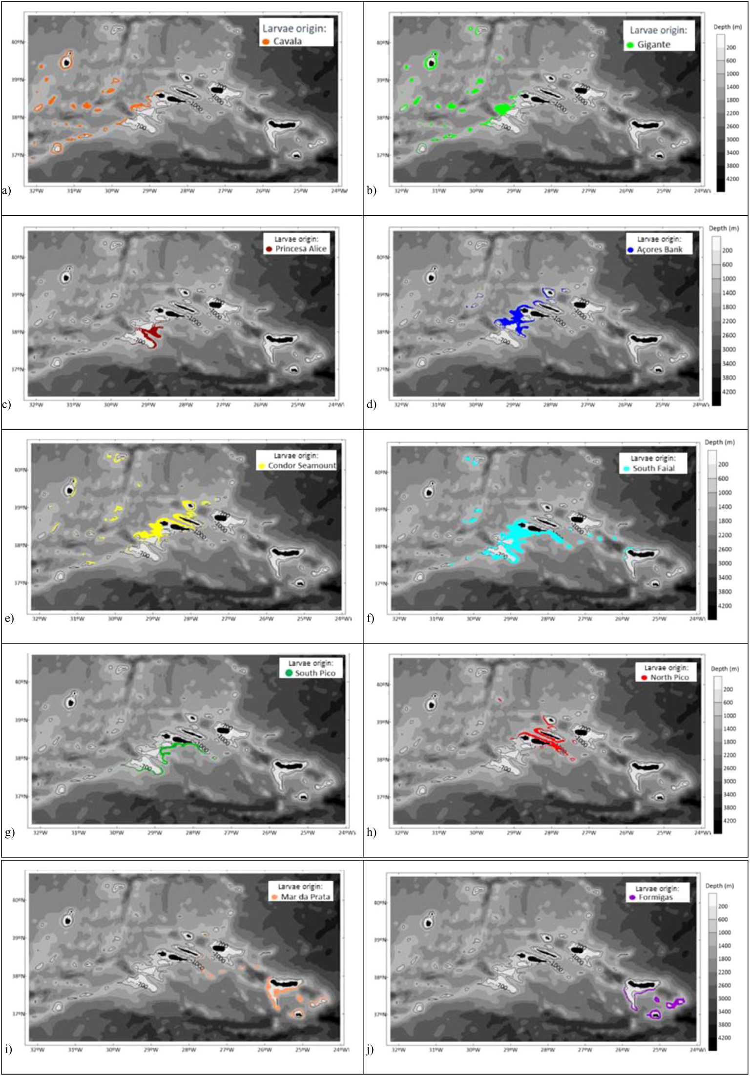 In this work, the potential larval dispersal of P. carpenteri deep-sea sponge aggregations in the Azores, it was modeled, as a proxy for the potential larval transport around Azores and evaluate the probability of the current MPAs to maintaining the connectivity of these benthic organism populations.