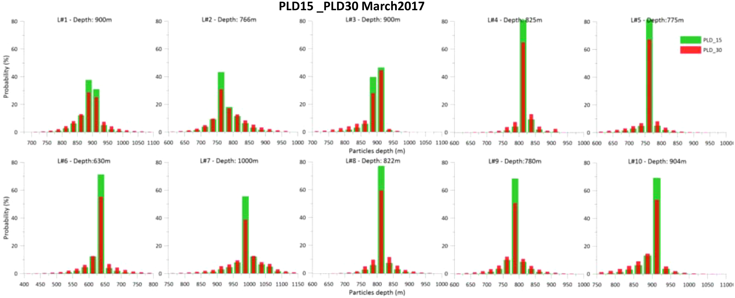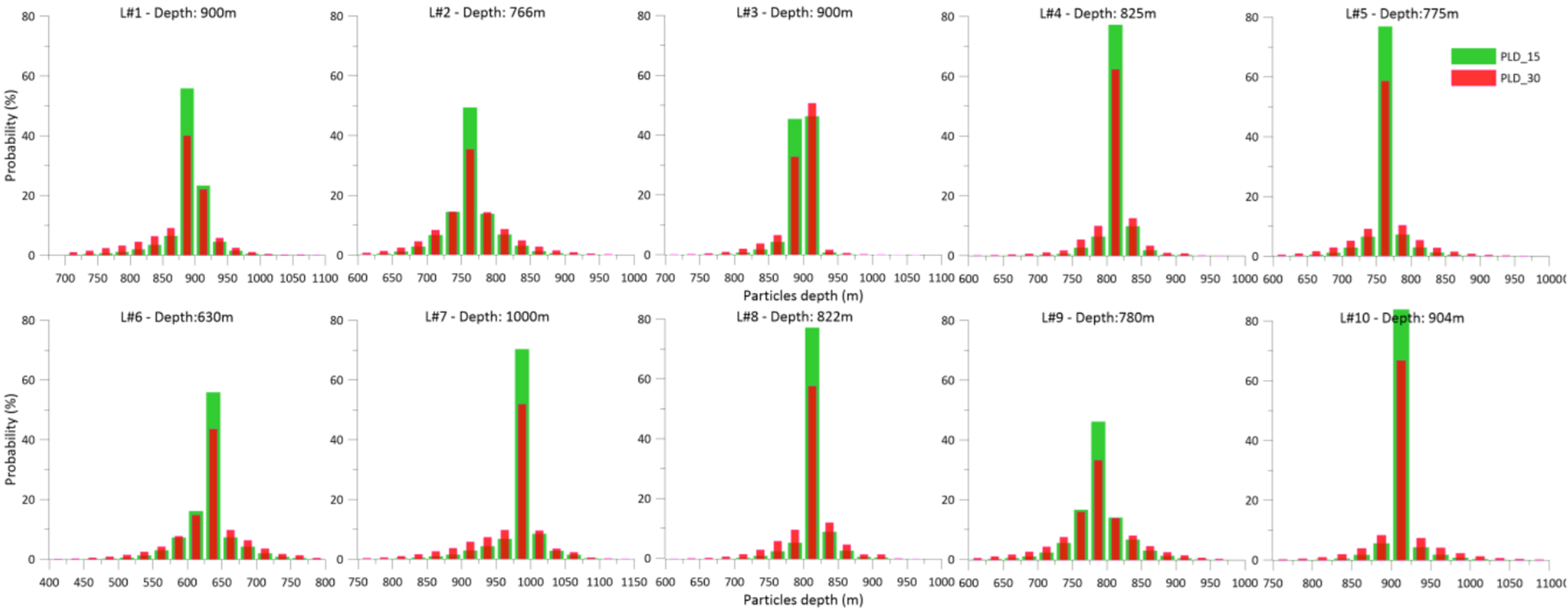 The model can simulate particles settlement in defined recruitment locations (in this case the sponge aggregations in the study). These recruitment locations are defined by a polygon (longitude, latitude and depth). Particle settlement starts after the defined PLD.