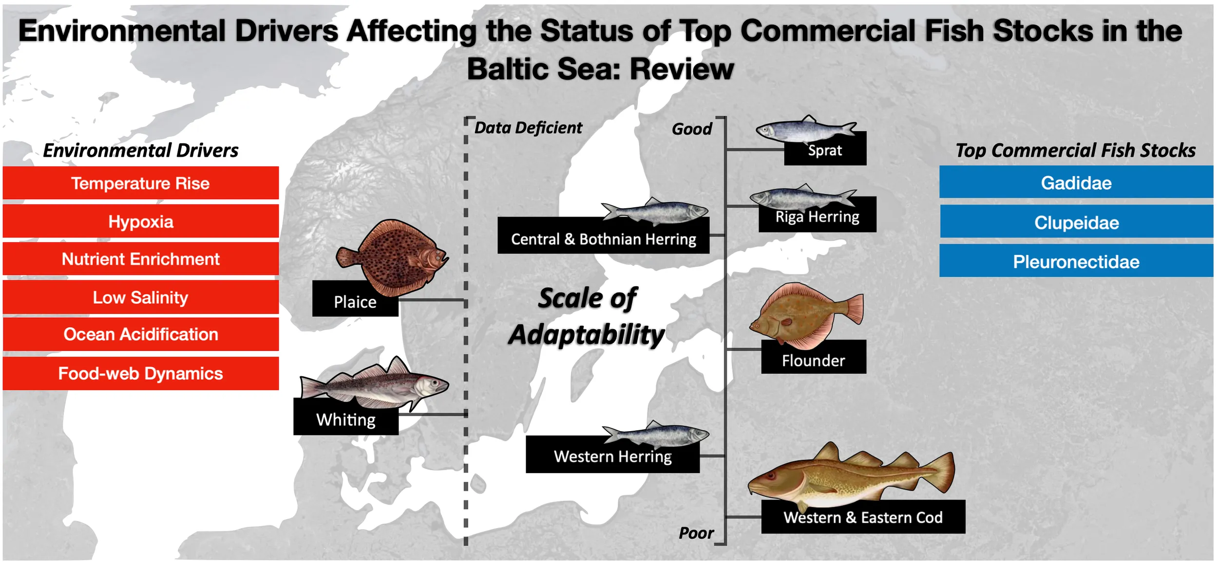 Like in many parts of the world, the Baltic Sea experiences a multitude of processes and stressors that influence fish stock dynamics. This paper compartmentalizes 250 publications that examine the cumulative effects and trade-offs of some of the most significant environmental drivers (temperature change, hypoxia, nutrient enrichment, acidification, low salinity, and food-web dynamics) on the ecology of top commercial fish species in the Baltic Sea (cod, sprat, whiting, herring, flounder, and plaice).
