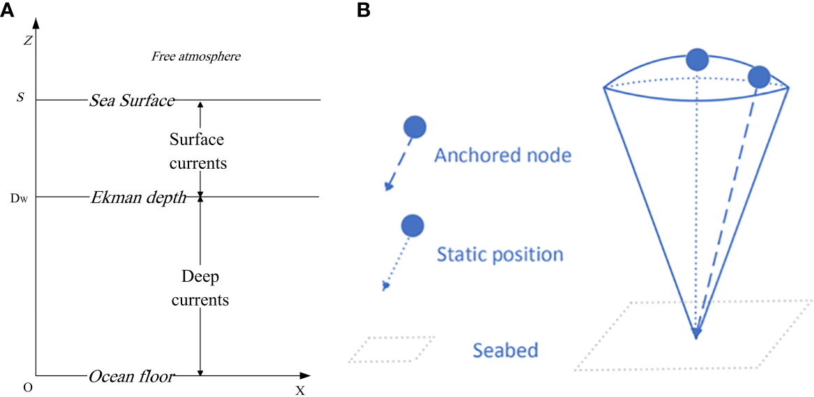 In this paper, the ocean below the Ekman depth belongs to the deep current. As shown in Figure 2B, the deep ocean flows westward, opposite to the Ekman transport direction. The current velocity between depth Dw and depth T increases uniformly from 0 to a fixed-value velocity deep, and the velocity from depth T to the seabed is fixed at velocity deep.