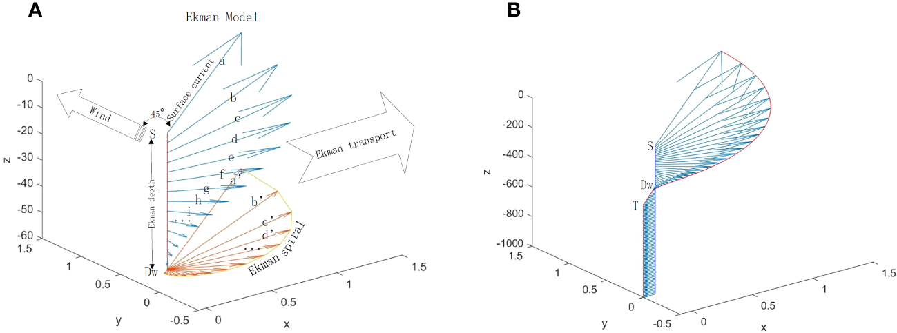 (A) Ekman current model. (B) Velocity and direction of each successive layer.