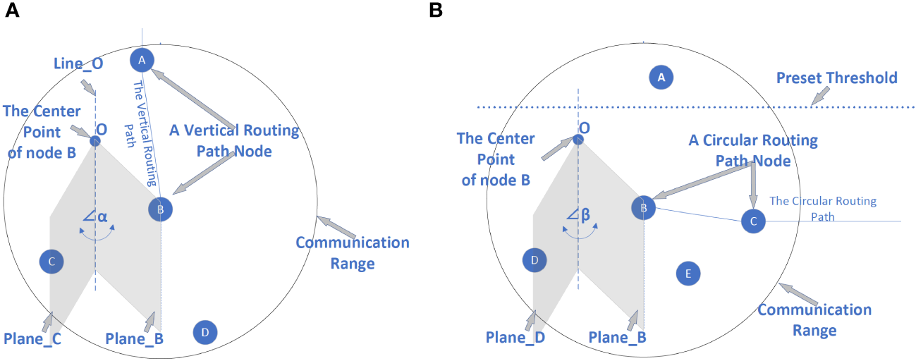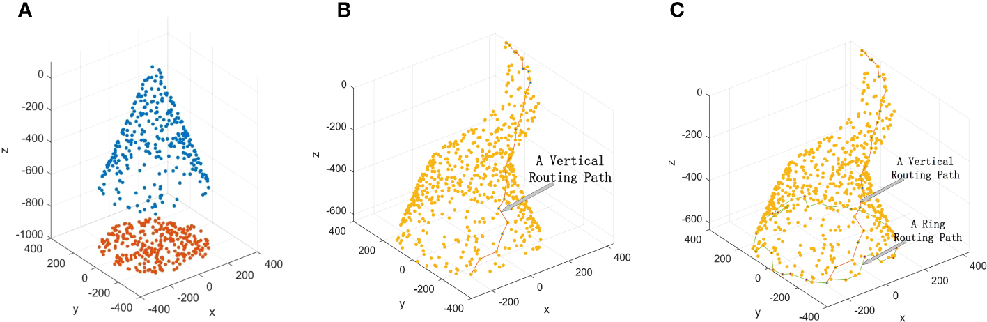 (A) Initial state of UASN. (B) Vertical routing path. (C) Circular routing path.