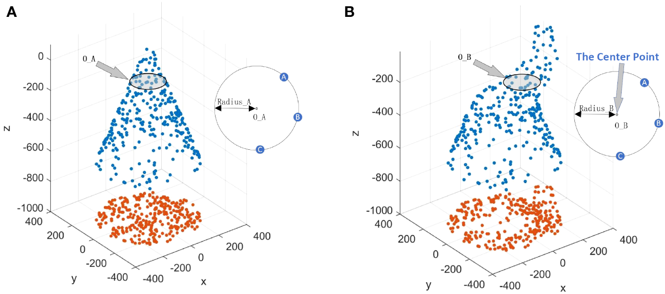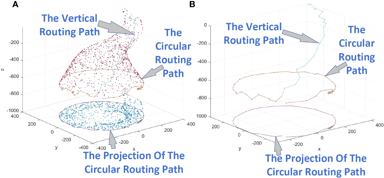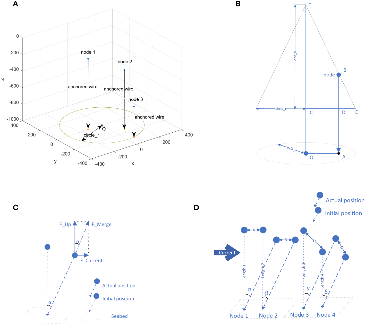 The sensor nodes owned by UASN are randomly distributed on the seabed. AUV assists these nodes to locate themselves and gives them the center coordinate and radius of the circle which includes all nodes. As shown in Figure 4A, three nodes are distributed in circle O, the center of circle O is (0, 0, 1,000), the radius = circle_r, and each node reaches the initial state by changing the length of the anchored wire.