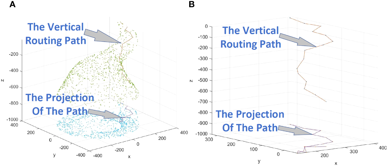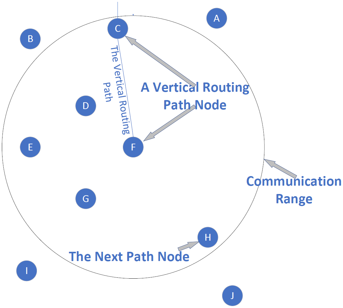 In the UASN, the vertical routing path is a transmission path for packets from the cone top to the bottom, and the path is constructed by UASN nodes. The vertical routing path is affected by ocean currents and spontaneously and dynamically by the UASN nodes. A good vertical path has at least two features, namely: