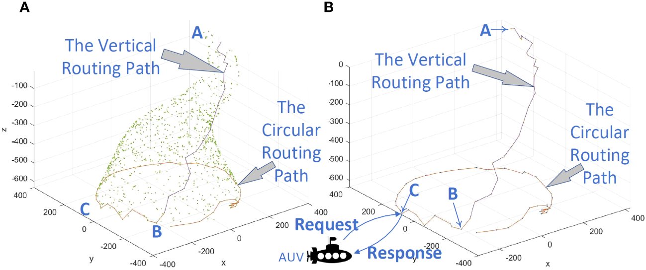 In order to balance the energy consumption and security performance, the UASN routing path consists of two parts: a routing path and a circular routing path. As shown in Figure 3B, the vertical routing path ensures that the packets can reach the deep ocean from the ocean surface. As shown in Figure 3C, the circular routing path increases the complexity of the routing path to strengthen the safety performance of the path. In addition, the AUV can flexibly select one node in the circular routing path to exchange packets.