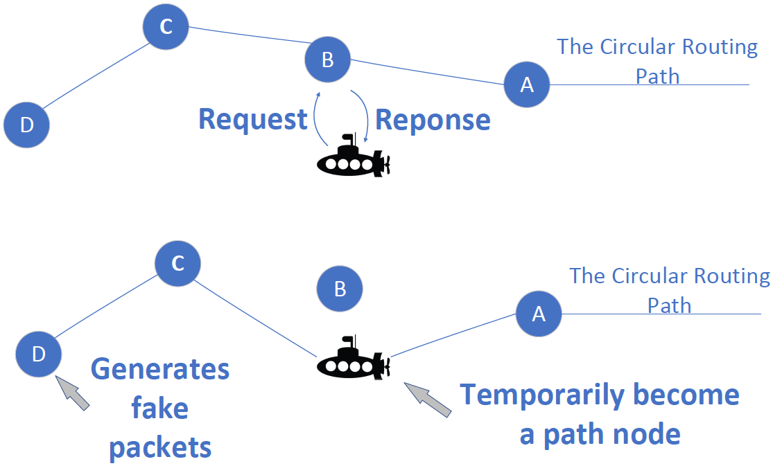 Attackers need to eavesdrop on data packets in the network when implementing backtracking attacks, so some solutions will actively monitor whether there is an attacker in the network and reduce the transmission of data packets near the attacker. The authors proposed a lightweight scheme to use against adversaries (Dutta et al., 2010). The network is divided into several grids. When a sensor node detects an attacker, it will inform all the nodes in its own grid, and these nodes will keep silent. When a grid boundary node discovers the attacker leaving, it will send a warning message to the adjacent grid and all the nodes in silence will get back to work. Y. Wang proposed a scheme based on circular trap (CT), which provides SLP protection by integrating the routing layer and MAC layer protocol (Wang Y et al., 2019). In the proposed scheme, a CT route is formed to induce an attacker to backtrack the packets from the nodes on the circular route, thereby making the attacker move away from the real route and the scheme protects the SLP.