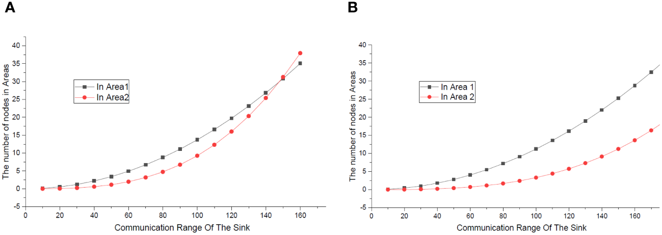 When ocean current exists, the connectivity of UASN may not be decreased and may even be increased. As shown in Figure 4D, the anchored wire of node 1 and node 2 are the same. In the same ocean current, α = β, so the distance between them in the initial position (A) and actual position (B) are equal. In other words, distance A = distance B. Compared with the initial state, the connectivity between the two nodes in the ocean current has not changed. The anchored wire length of node 4 is shorter than that of node 3. Although γ = δ is derived from Equation 12, distance C > distance D, which means that the connectivity between the two nodes in the current is optimized compared to the initial state.
