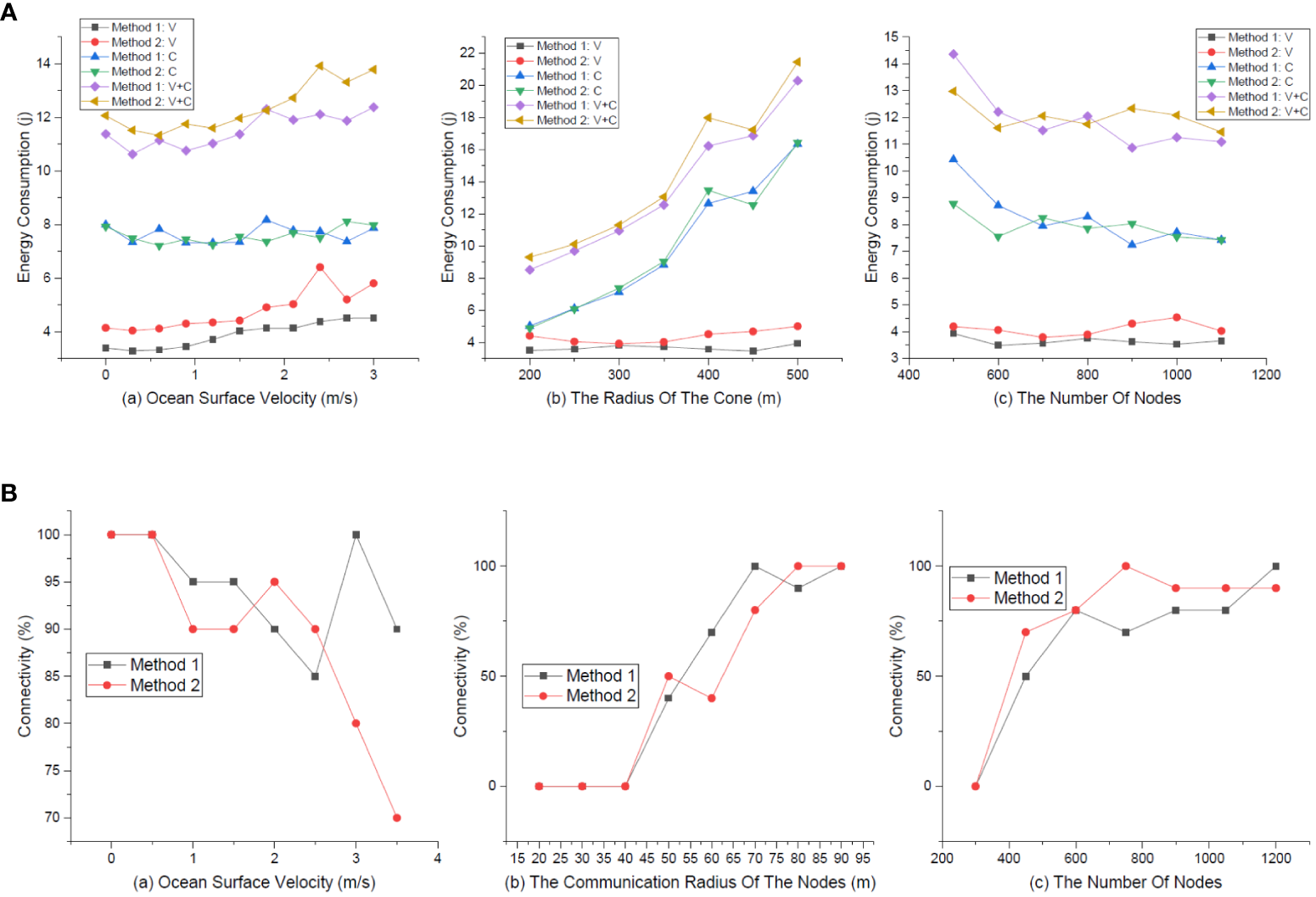 The relationship between the connectivity and the ocean surface velocity is shown in Figure 16B.a, in which the metrics are settled as “Values (a)” in Table 2. Unlike Method 1, Method 2 generates a vertical routing path that takes Ekman layer into account. We expected ConeSLP with Method 2 to have better connectivity at any ocean surface velocity than with Method 1, but the experiments provide different results than expected. We first discuss the connectivity of ConeSLP using Method 1 at a different ocean surface velocity. For ease of exposition, we refer to the connectivity rate of ConeSLP using Method 1 as the connectivity of Method 1. The connectivity of Method 1 decreases continuously when the ocean surface velocity ranges from 0 to 2.5 m/s. This is consistent with common sense. Whereas at the ocean surface velocity in the range of 2.5 to 3 m/s there is an increase in Method 1’s connectivity because the cone undergoes severe deformation and nodes on one side of the cone are able to communicate directly with nodes on the other side, as the ocean surface velocity increases and further cone deformation occur, the connectivity of Method 1 decreases dramatically. We next discuss the connectivity of Method 2 at a different ocean surface velocity. The connectivity of Method 2 maintains a decreasing trend when the ocean surface velocity ranges from 0 to 1.5 m/s. When the range of the velocity is from 1.5 to 2, the connectivity of Method 2 increases, and the scheme gets good results by considering Ekman layer factors; in other words, Equation 13 gets better results under the value of current ocean surface velocity. When the ocean surface velocity is bigger than 2 m/s, the connectivity of Method 2 decreases rapidly. It should be noted that when the ocean surface velocity is at 3.5 m/s, the connectivity of Method 2 is significantly lower than Method 1. There are at least two reasons: first, compared with Method 1, Method 2 constructs a vertical routing path that requires more path nodes, which reduces the connectivity; and second, when the cone is severely deformed, the parameters of Equation 13 are not adjusted.