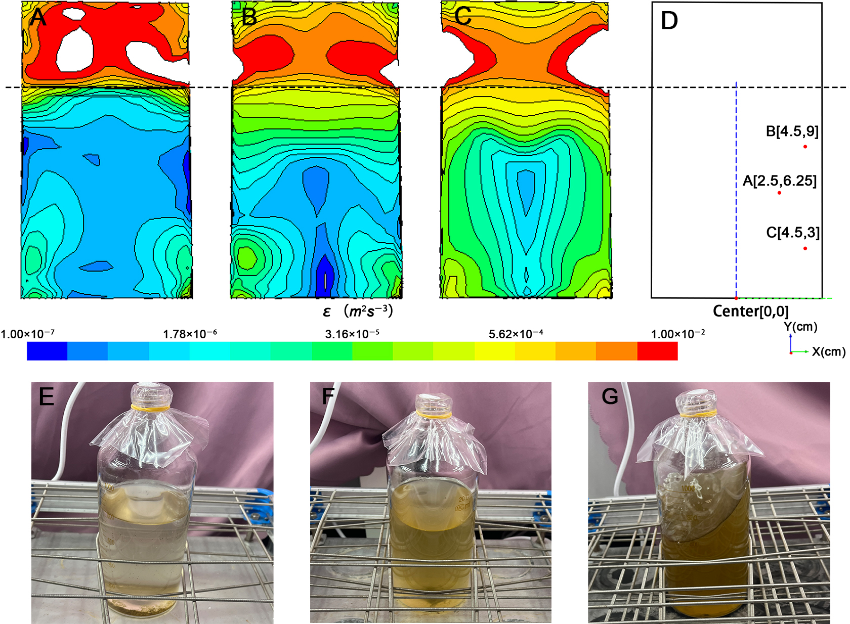 The CFD model of the culture system at the rotation rates of (A) 60 rpm, (B) 120 rpm, (C) 180 rpm, (D) is the coordinate system of the flask established with the center of the bottle bottom as the origin, the algae distribution of (E) 60 rpm, (F) 120 rpm, (G) 180 rpm.