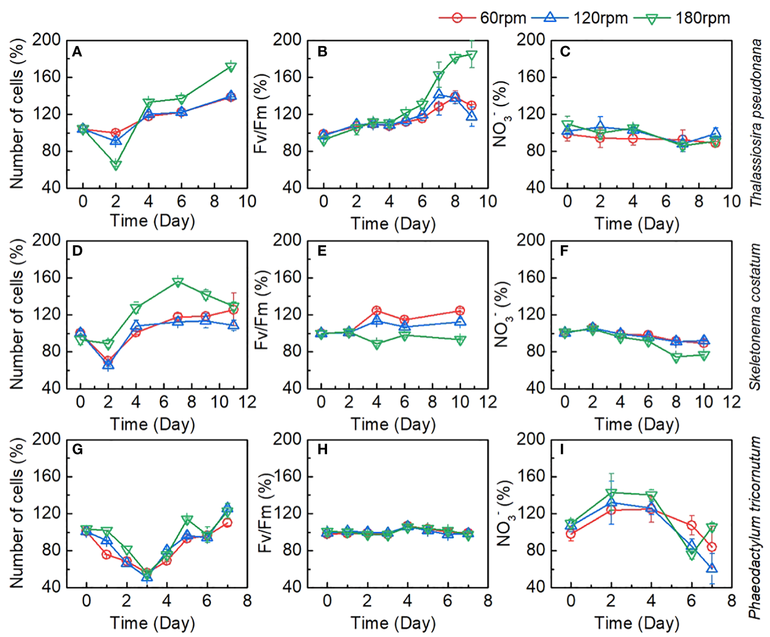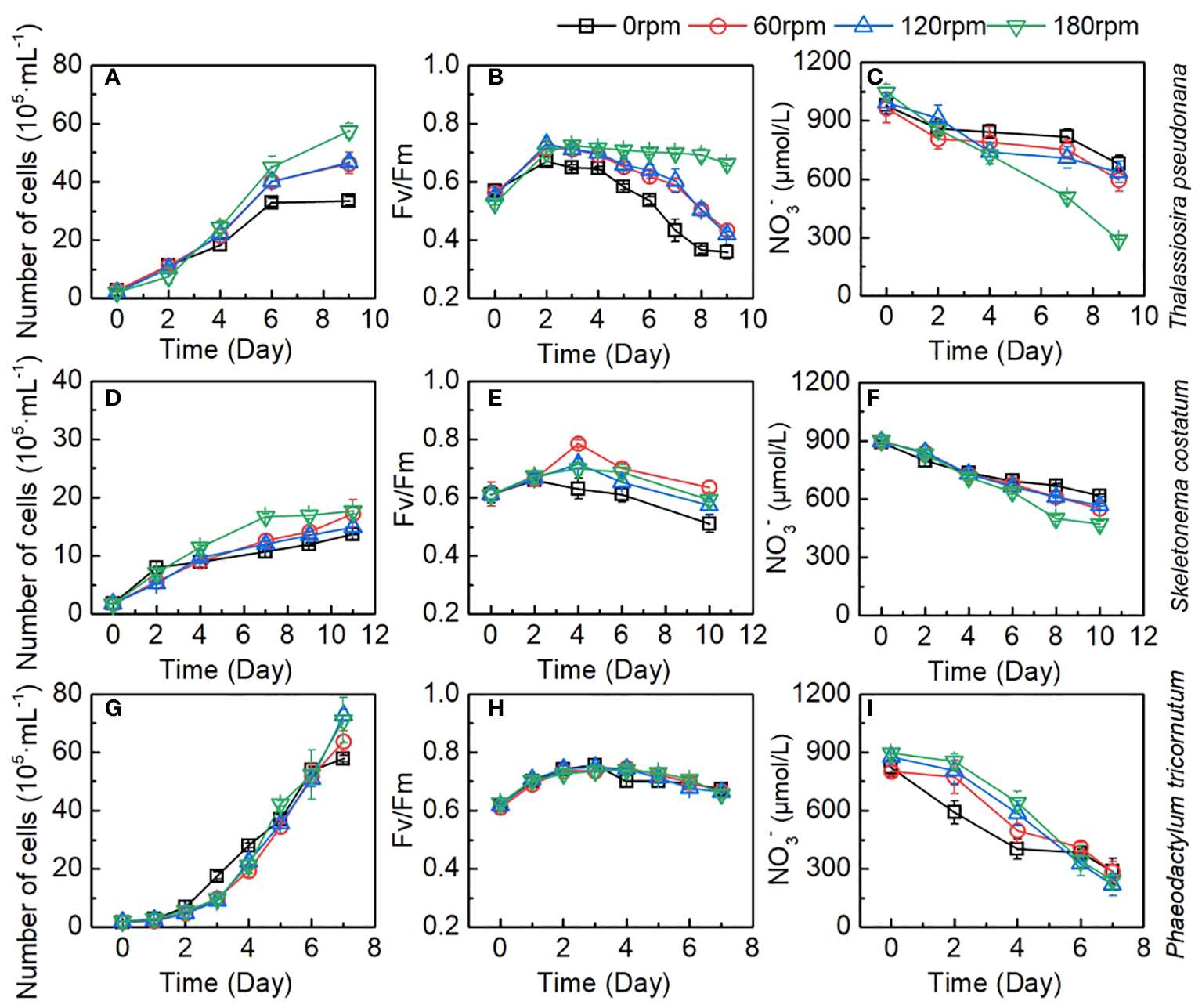 Changes of number of cells, Fv/Fm, and NO3- as a proportion of control group during the culture of (A–C)Thalassiosira pseudonana; (D–F)Skeletonema costatum; (G–I)Phaeodactylum tricornutum under different turbulence intensities. Each point is the mean of three replicate incubations and error bars represent the standard deviation of replicates (n=3).