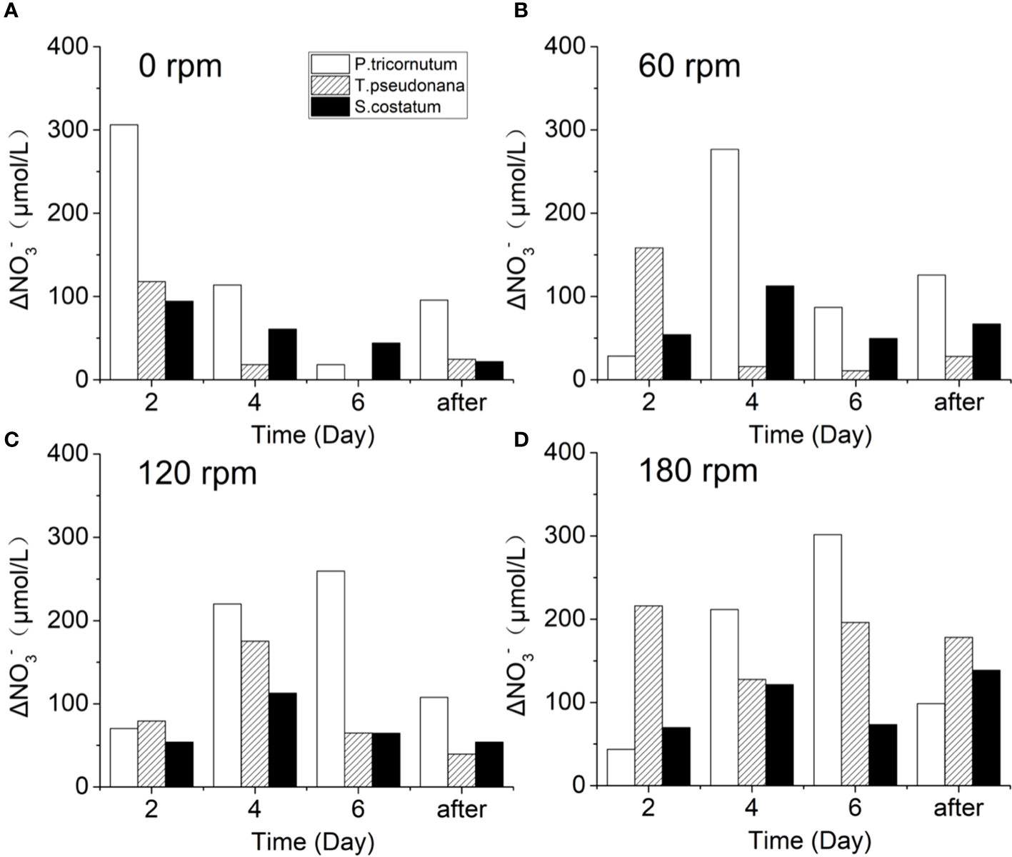 Changes of ΔNO3- during the culture of three diatoms under turbulence intensity of (A) 0 rpm, (B) 60 rpm, (C) 120 rpm, and (D) 180 rpm.