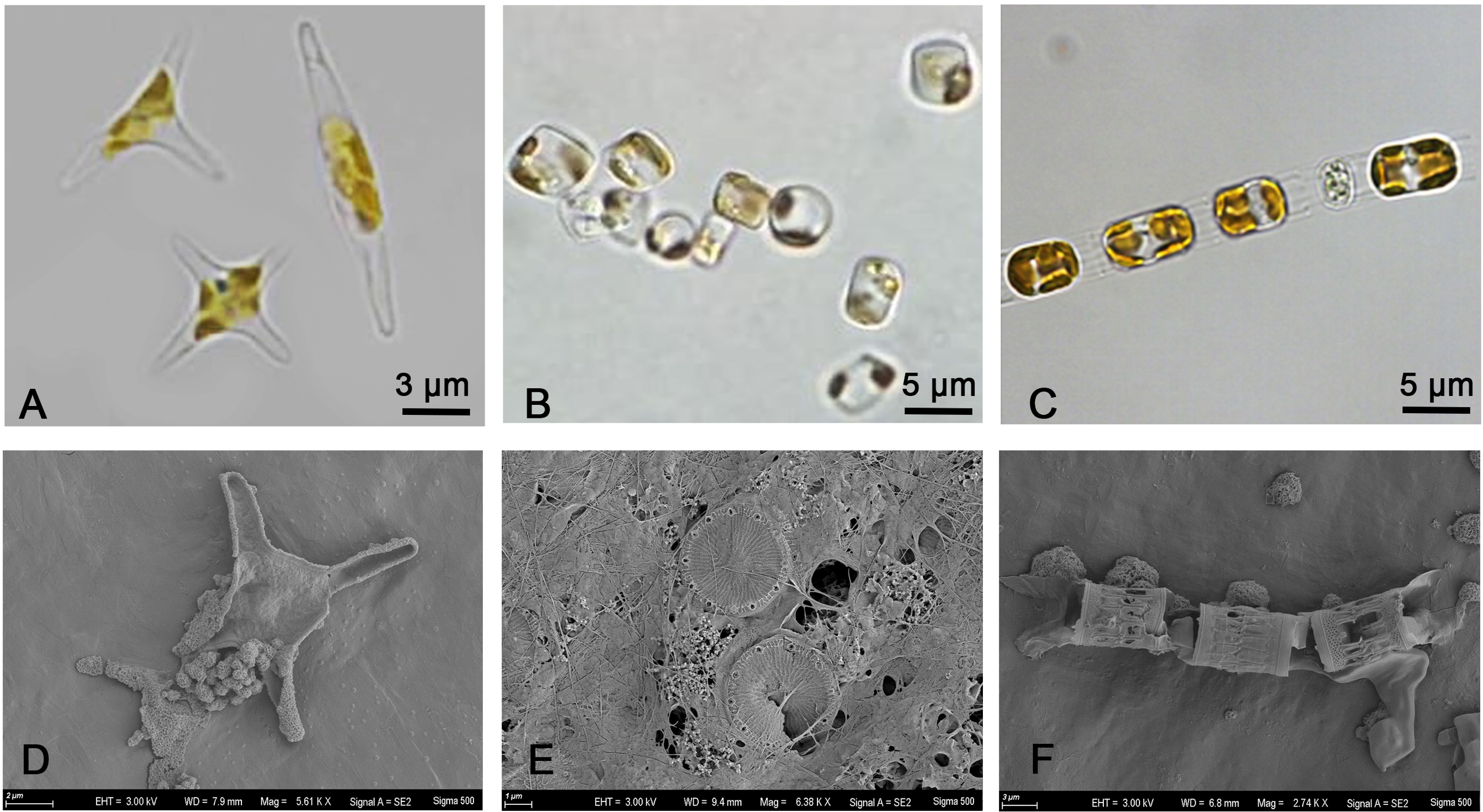 Optical microscope image of (A) Phaeodactylum tricornutum, (B) Thalassiosira pseudonana, (C) Skeletonema costatum. Scanning electron microscope (SEM) image of (D) Phaeodactylum tricornutum, (E) Thalassiosira pseudonana, (F) Skeletonema costatum.