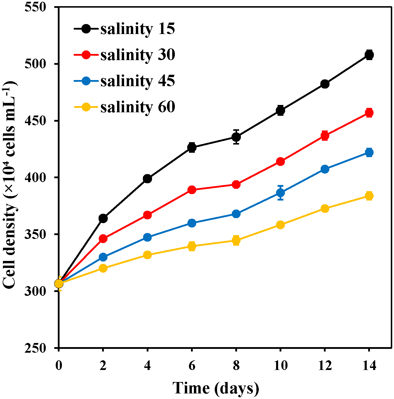 Changes in the cell density of E. marina at different levels of salinity (mean ± SD, n = 3).