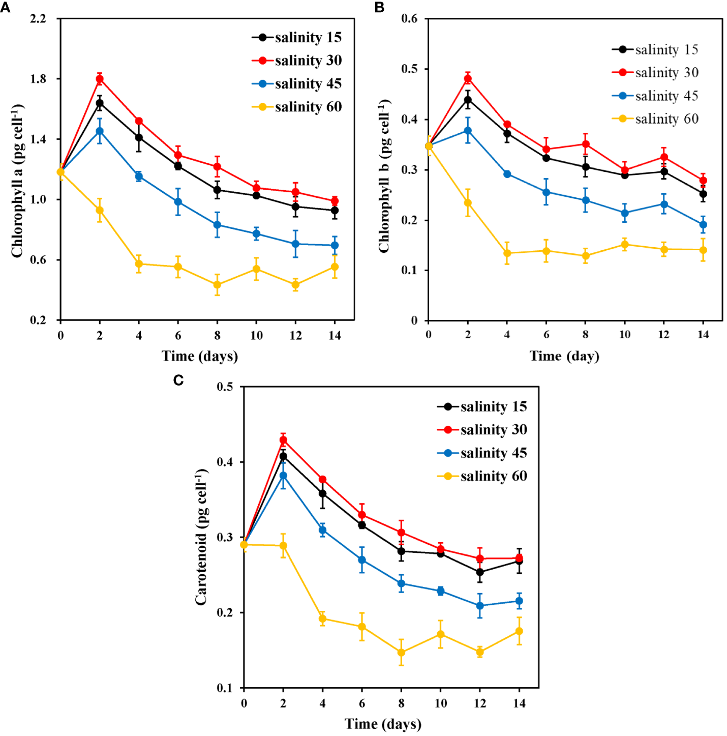 Changes in chlorophyll a(A), chlorophyll b(B), and carotenoid (C) content of E. marina at different levels of salinity (mean ± SD, n = 3).