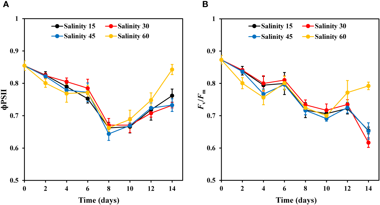 Changes in ФPSII (A) and Fv/Fm(B) of E. marina at different levels of salinity (mean ± SD, n = 3).
