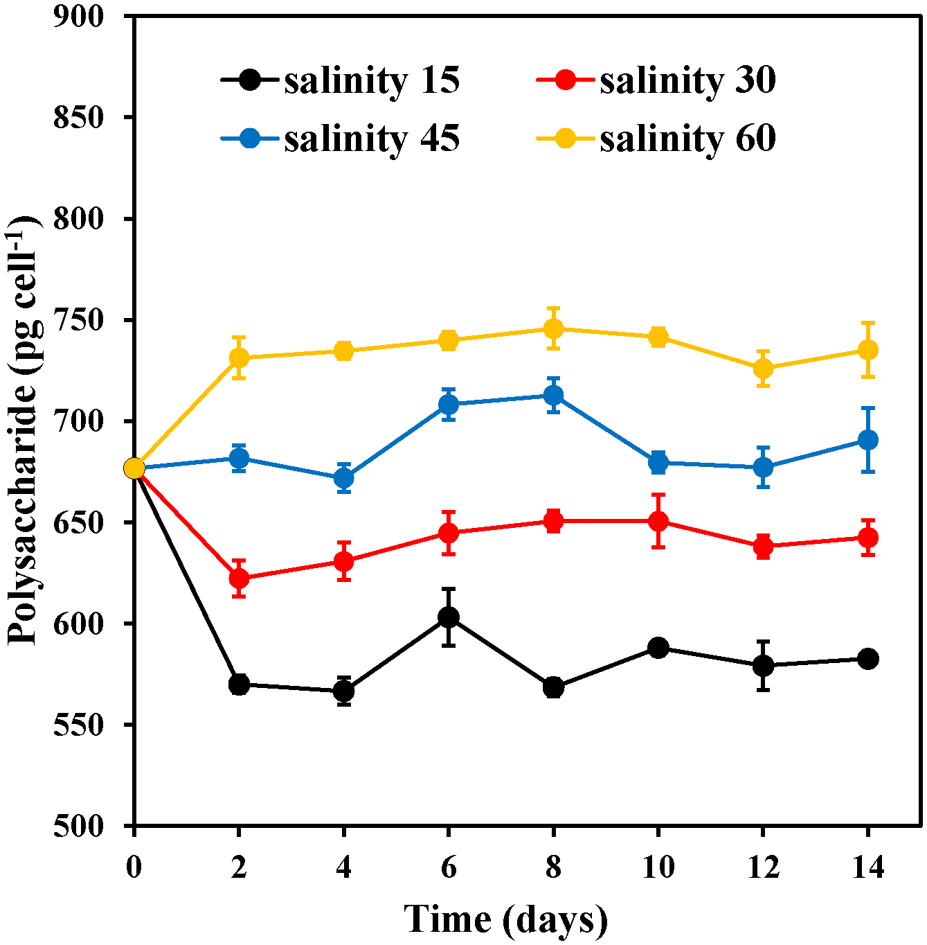 The polysaccharide content of E. marina significantly increased with increasing salinity (Figure 5). Salinity levels of 15‰ and 30‰ exhibited a swift decrease from days 0 to 2, while the salinity 45‰ group maintained its initial level after day 2. The polysaccharide content in the 60‰ group was significantly (P< 0.05) higher (745.63 pg cell-1) on the 8th day of cultivation than the low polysaccharide content observed in the 15‰ group during the same period.