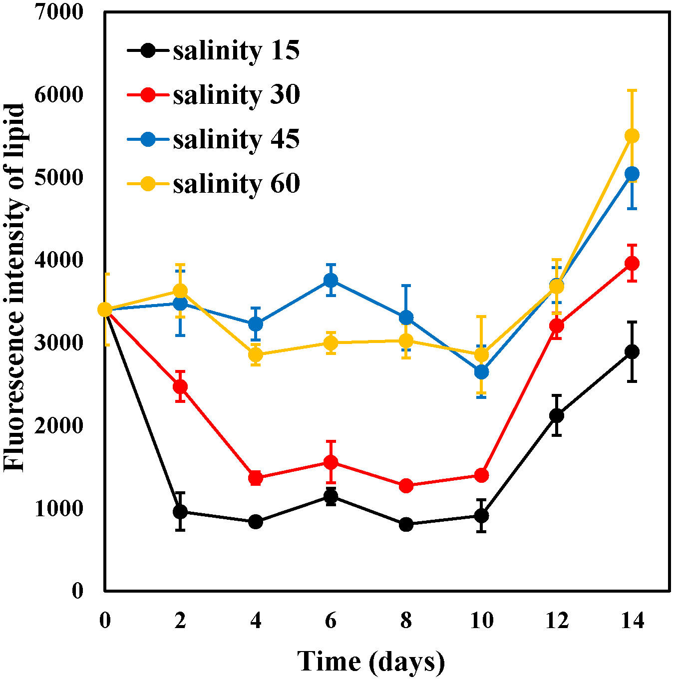 Changes in the fluorescence intensity of lipid content of E. marina at different levels of salinity (mean ± SD, n = 3).