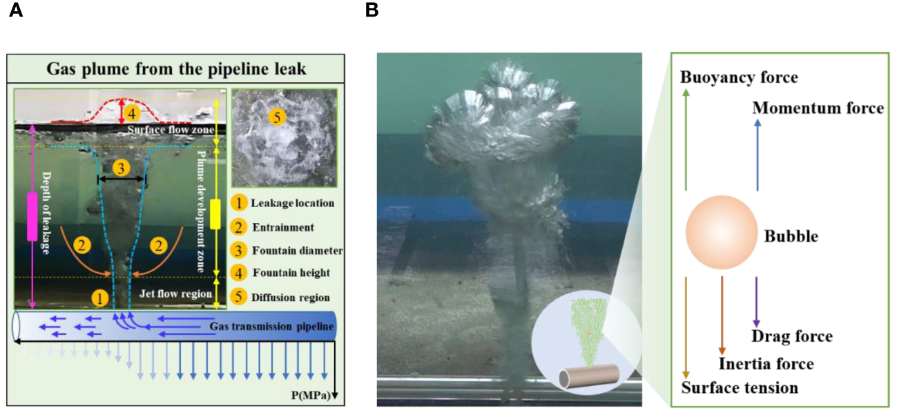 The investigation of the fountain characteristics necessitates the thorough analysis of the movement and forces acting on the bubble plume within water. The escaping gas jets into the water and rapidly expands in the upper space due to the high pressure within the pipeline during the leakage events. The bubble plume field can be systematically categorized into three distinct regions (Figure 2A): (1) Jet flow region; (2) Plume development area; (3) Surface flow area (Olsen et al., 2017). The initial kinetic energy of the leaking gas dominates the movement of bubble in the jet flow region. The surrounding water is entrained into the bubble plume in the plume development zone, which leads to the gradual increase in the radius of the bubble plume. As the initial kinetic energy of the leak is dissipated through entrainment, buoyancy becomes the primary force driving the gas towards the water surface. Concurrently, the bubble plume obtains radial velocity due to the retardation and shearing effects of the overlying water, resulting in the outward diffusion of air mass and the formation of the wider plume. It will expand further as the plume height increases (Li, 2019). The interaction between gas and water surface will be occur when the gas reaches the water surface, creating the fountain effect that further enlarges the bubble plume (Li et al., 2019). The interaction action also triggers radial flow in the near-surface seawater, forming the surface flow area. The bubble volume gradually increases due to decreasing ambient pressure during the rise process of the bubble (Yapa et al., 2010).
