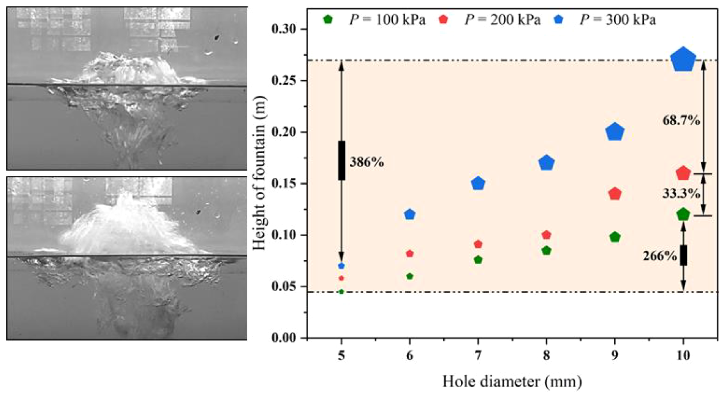 (1) The maximum height and width of the fountain exhibit the rising trend as the leakage pressure and diameter of the leakage hole increase. The combined effect of high leakage pressure and leakage hole diameter significantly enhances the height and diameter of the fountain. Consequently, it can be deduced that the change in fountain size during the leakage of large holes will be more pronounced.