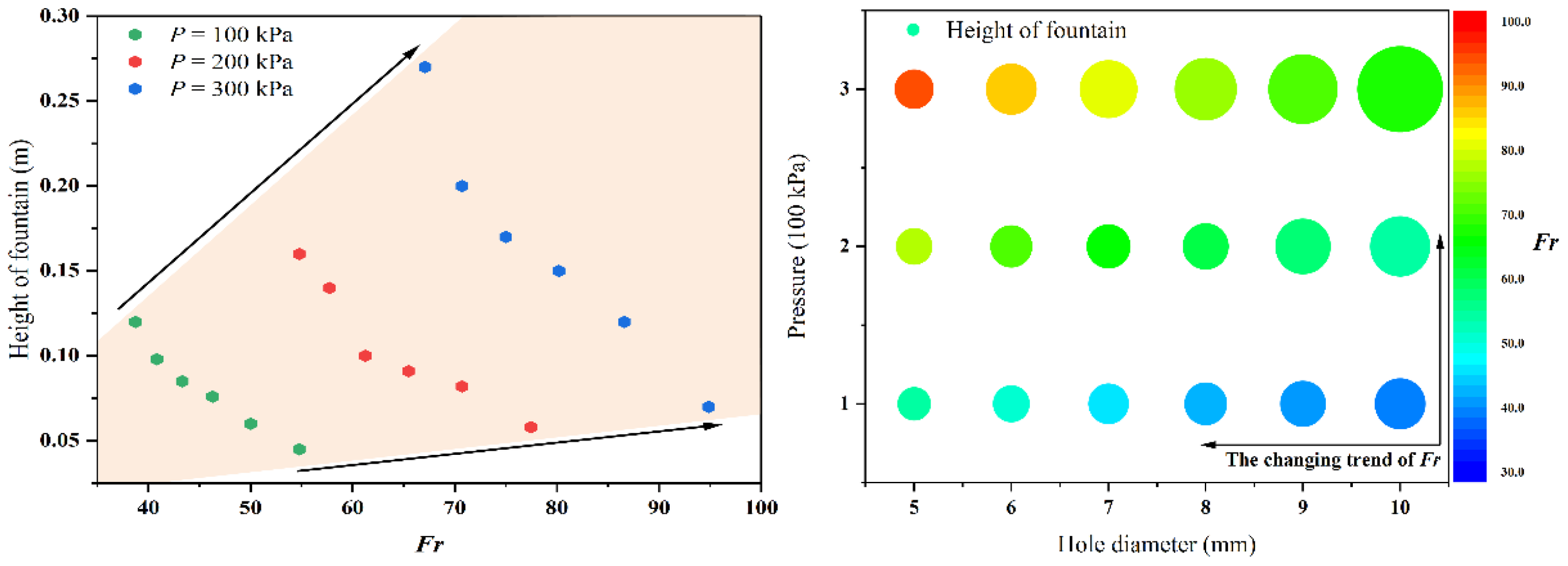 (2) Dimensional analysis reveals that the force state of the bubble is influenced by the Froude number (Fr) and Reynolds number (Re). Both Fr and Re values increase with an increase in leakage pressure. The leakage hole diameter exhibits the negative correlation with Fr and the positive correlation with Re. Therefore, it is crucial for understanding the morphological development of the fountain in the event of gas leakage by monitoring and controlling the Fr and Re values of the leakage hole