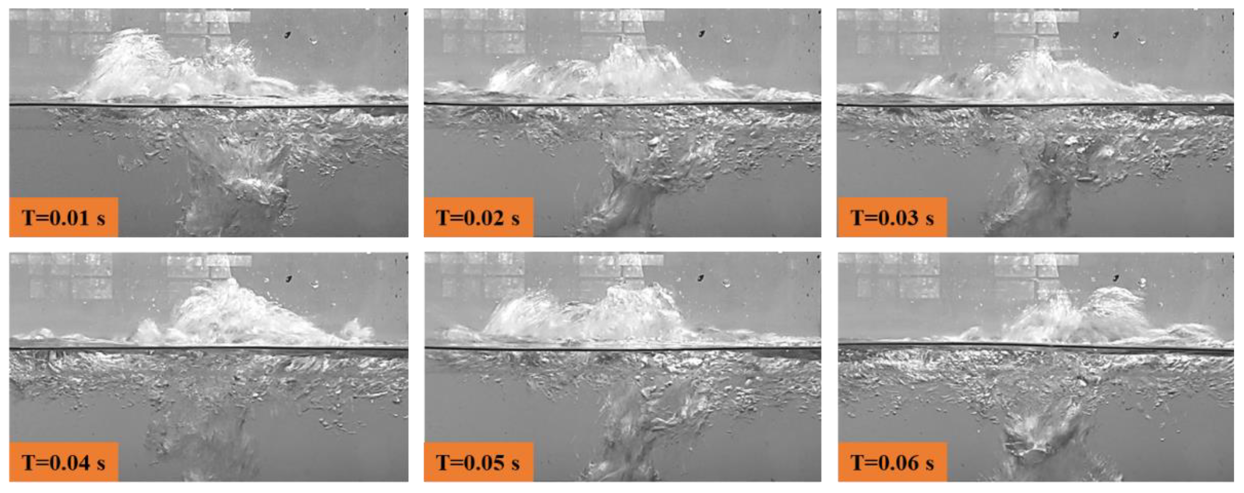 The gas leakage from the undersea gas pipeline can form bubbles plume that create the fountain effect on the water surface (Sausa et al., 2023; Wise and Hunt, 2023). The physical characteristics of the fountain are related to the release and diffusion of the bubble plume in the water (Cardoso and Cartwright, 2024). To analyze the physical characteristics of the fountain formed by the bubble plume on the water surface, the researchers mainly use integral model and computational fluid dynamics (Johansen, 2000; Benham, 2023; Garvey and Fowler, 2024). The integral model describes the radial velocity distribution of the plume in accordance with the Gaussian distribution, indicating that the fountain shape is inverted conical (Nazir et al., 2008 and Afenyo et al., 2017). Then, a series of models are derived to describe the characteristics of the fountain. Johansen (2003) suggested that the gas might be dissolved in seawater after combining with seawater, and then affect the development of physical size of the fountain. Zheng et al. (2003) proposed a model to simulate deep-water oil and gas accidental leakage, which analyzed the effect of the non-ideal behavior of bubble plumes on the size of the fountain. Yapa et al. (2012) analyzed the effect of unsteady three-dimensional changes of water flow and density stratification on the flow of bubbles in water, and found that environmental conditions, gas type, and medium mixing ratio could significantly affect the fountain phenomenon. The integral model can predict the physical parameters of springing under certain specific conditions. However, the semi-empirical formulas based on integral models can only predict the average geometric characteristics of the stable state fountain, neglecting the transient characteristics of the bubble plume influence on the fountain phenomenon (Wu et al., 2017).