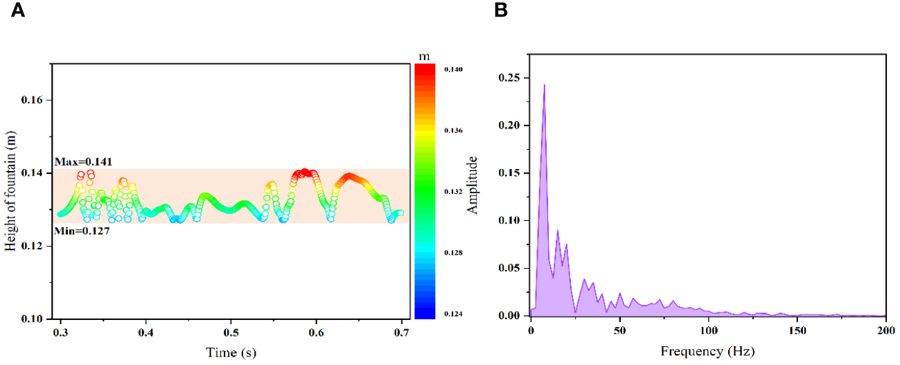 (A) Random fluctuation characteristics of fountain height; (B) Frequency distribution of fountain height time series data.