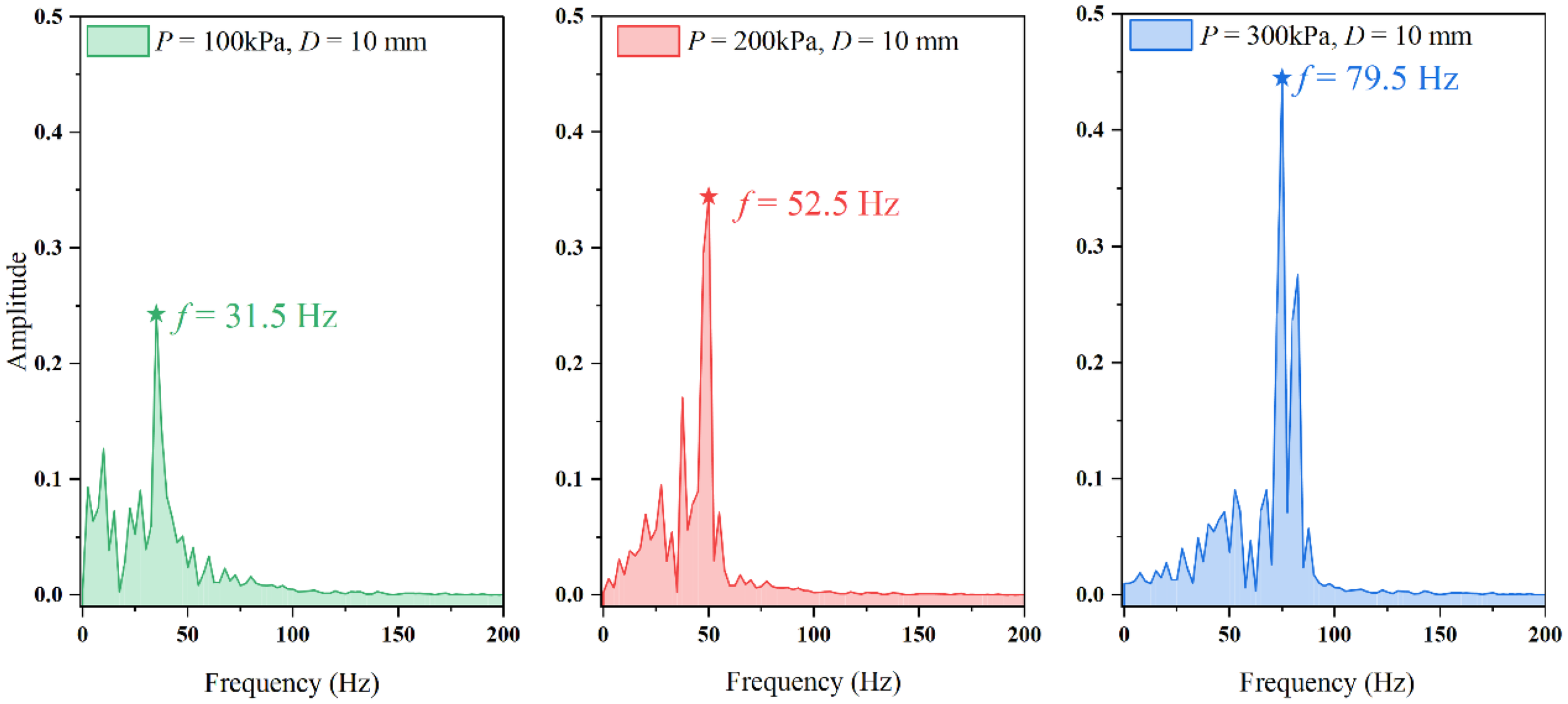 It is evident that the main frequency exhibits an upward trend with increasing leakage pressure. Figure 10 illustrates that the corresponding main frequencies for the three leakage pressures are 31.5 Hz, 52.5 Hz, and 79.5 Hz, respectively. Notably, the leakage pressure has more profound impact on the variation characteristics of the secondary main frequency compared to the primary main frequency. Additionally, the bandwidth of the frequency gradually widens as the leakage pressure increases. The presence of high-frequency data in the spectrum indicates sharp fluctuations in the shape of fountain, whereas low-frequency data suggests the stable and smaller fountain form.