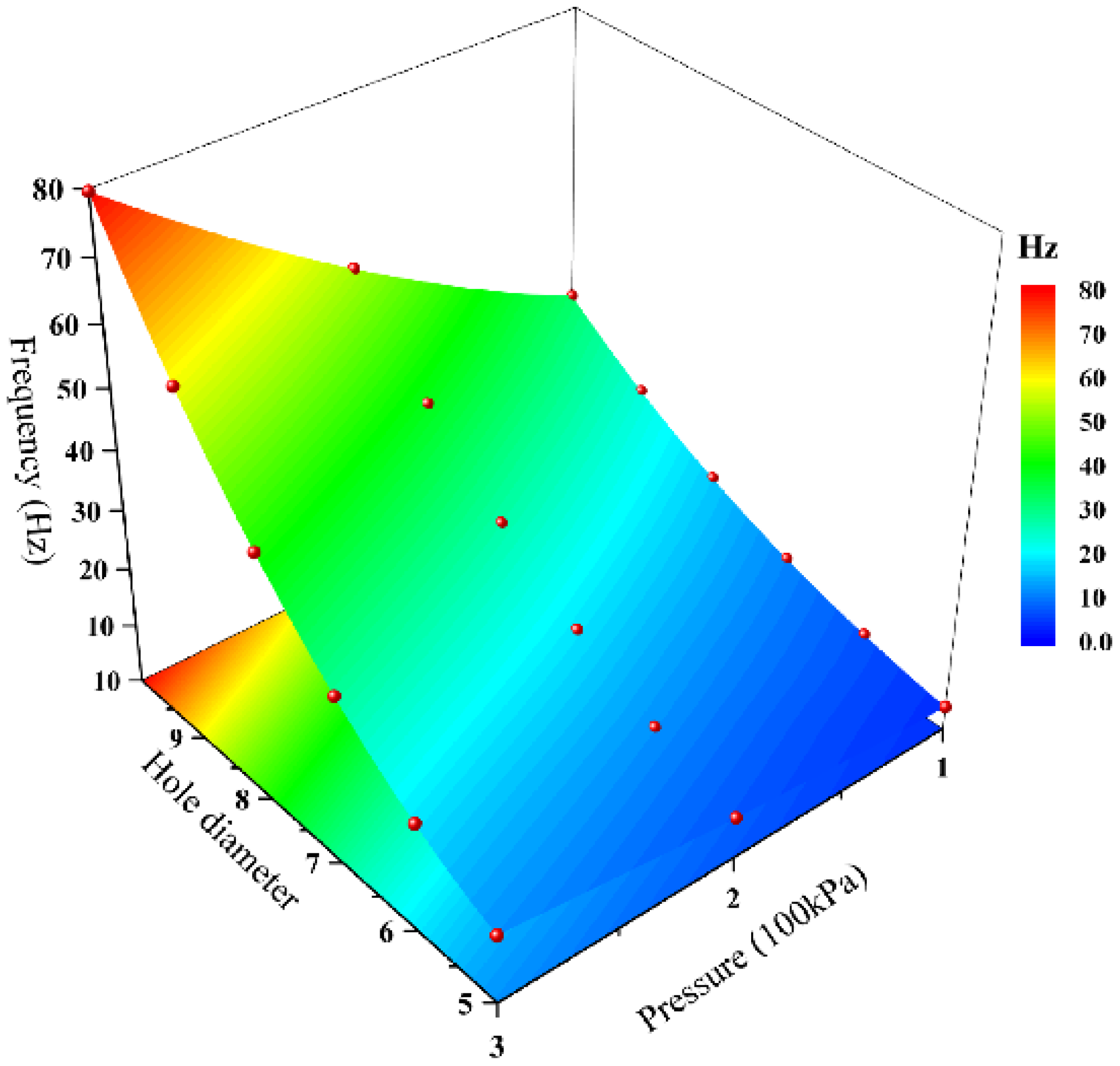 Surface fitting relationship between leakage pressure, leakage hole diameter and main frequency.