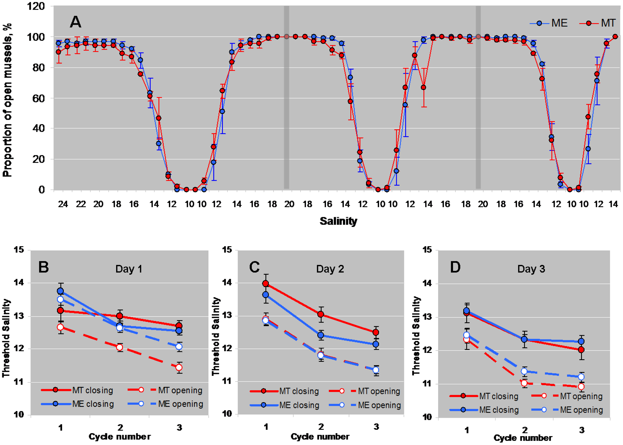 Behavioral responses of M. edulis and M. trossulus from the White Sea to salinity up- and downshifts. (A) - changes in the proportion of open mussels in the course of three successive cycles (separated by vertical bars) of lowering and increasing salinity (average for three experimental replicates (days), N=3). (B–D) - threshold salinities of closing and opening of mussels Mytilus edulis (ME) and Mytilus trossulus (MT) in the course of lowering and increasing salinity in three experimental replicates (days). N=30 for both ME and MT. Means ± SE's are presented.