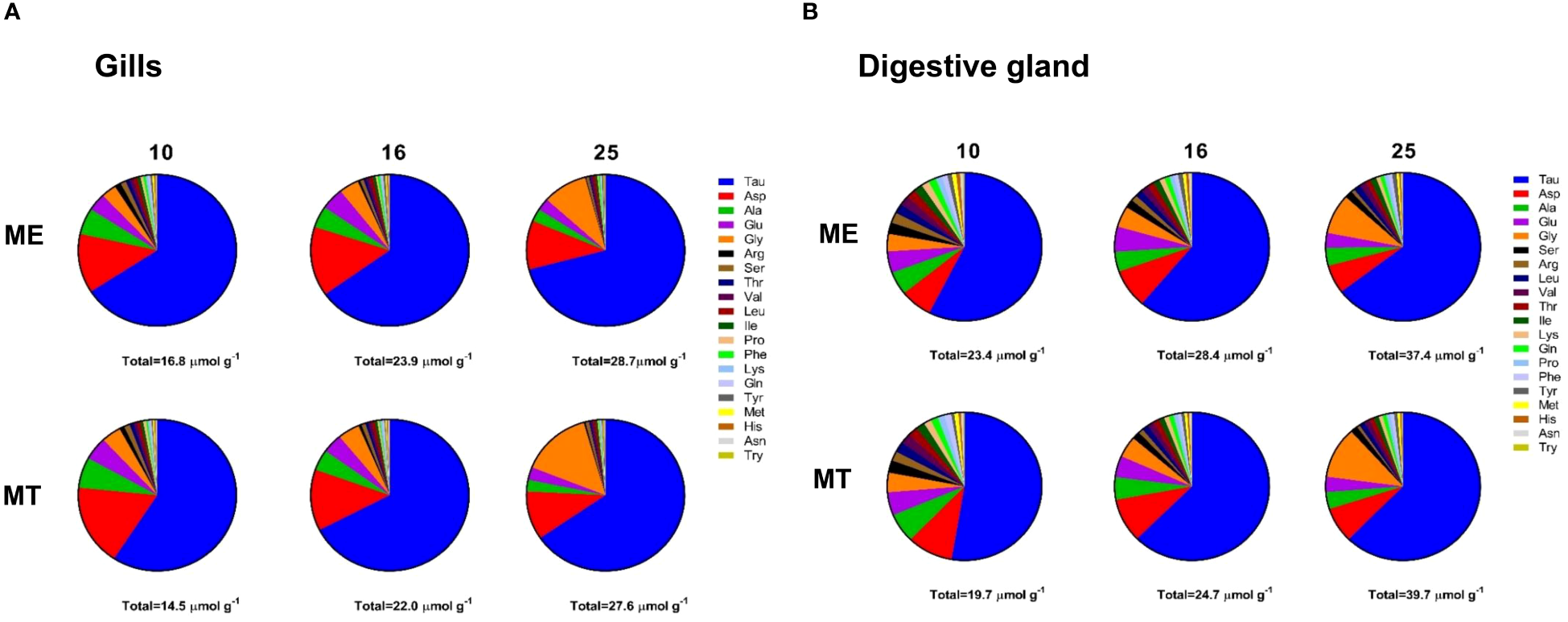 Molar composition of the FAA pool in the gills (A) and the digestive gland (B) tissues of mussels acclimated under different salinity conditions. ME, M. edulis; MT, M. trossulus. Data for acclimation salinities 10, 16 and 25 are shown. The sum of the molar concentrations of 20 FAAs is given under each pie chart.