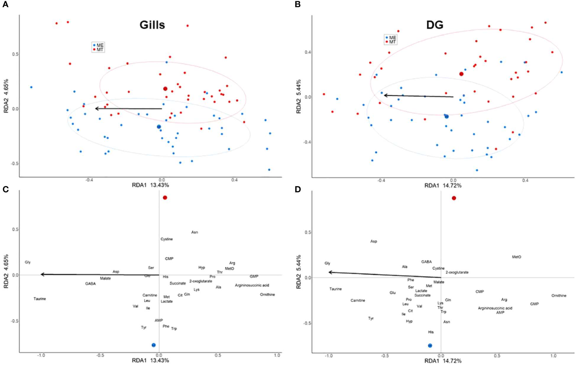 Ordination of individuals [(A) - gills, (C) - digestive gland] and metabolites [(B) - gills, (D) - digestive gland] in the two canonical RDA axes. (A, C) –red and blue symbols correspond to M. trossulus and M. edulis, respectively. (B, D) - an arrow points in the direction corresponding to an increase in salinity. The large red and blue filled circles mark the centroids corresponding to the two species (MT, M. trossulus; ME, M. edulis), the ellipses show the 95% confidence intervals.