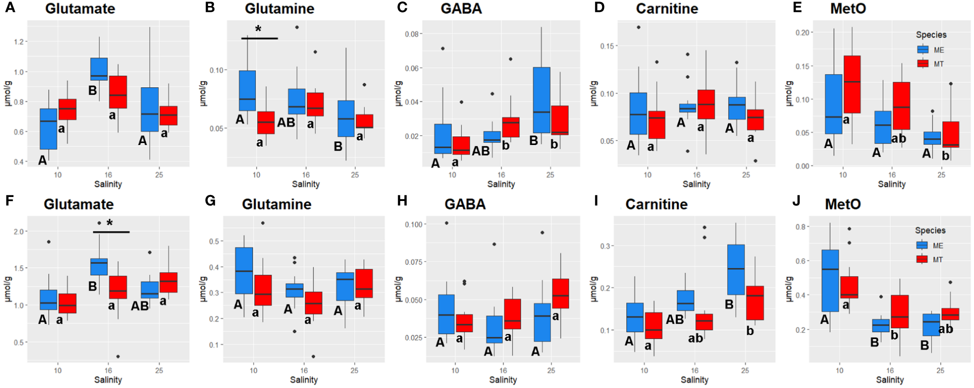 Salinity- and species-specific concentrations of glutamate (A, F), glutamine (B, G), GABA (C, H), carnitine (D, I) and methionine sulfoxide (E, J) in the tissues of the White Sea Mytilus spp. Significantly different values (P<0.05) in mussels at different salinities are indicated with different letters (upper case letters for M. edulis, and lower case letters for M. trossulus). Significant (P<0.05) difference between species within each salinity is indicated by horizontal bar with an asterisk. N = 10–15 (for sample sizes within each species- and salinity-specific group see Supplementary Tables 2, 3). (A–E) – gills; (F–J) – digestive gland. ME, M. edulis; MT, M. trossulus.