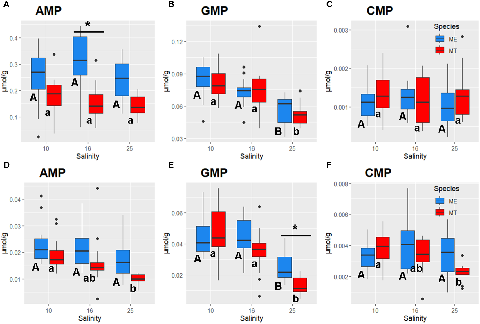 Salinity- and species-specific concentrations of nucleoside monophosphates in the tissues of the White Sea Mytilus spp. Significantly different values (P<0.05) in mussels at different salinities are indicated with different letters (upper case letters for M. edulis, and lower case letters for M. trossulus). Significant (P<0.05) difference between species within each salinity is indicated by horizontal bar with an asterisk. N = 10–15 (for sample sizes within each species- and salinity-specific group see Supplementary Tables 2, 3). (A–C) – gills; (D–F) – digestive gland. (A, D) – AMP, (B, E) – GMP, (C, F) – CMP. ME, M. edulis; MT, M. trossulus.