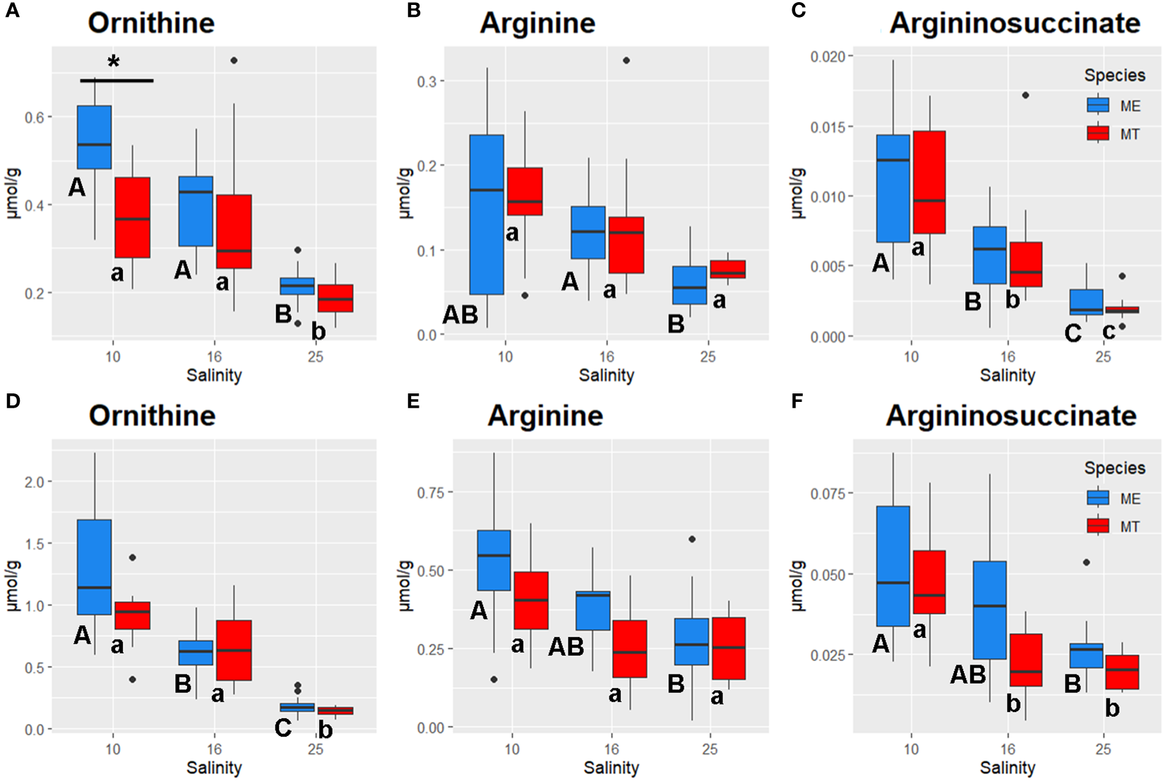 Salinity- and species-specific concentrations of urea cycle intermediates in the tissues of the White Sea Mytilus spp. Significantly different values (P<0.05) in mussels at different salinities are indicated with different letters (upper case letters for M. edulis, and lower case letters for M. trossulus). Significant (P<0.05) difference between species within each salinity is indicated by horizontal bar with an asterisk. N = 10–15 (for sample sizes within each species- and salinity-specific group see Supplementary Tables 2 and 3). (A–C) – gills; (D–F) – digestive gland. (A, D) – ornithine, (B, E) – arginine, (C, F) – argininosuccinate. ME, M. edulis; MT, M. trossulus.
