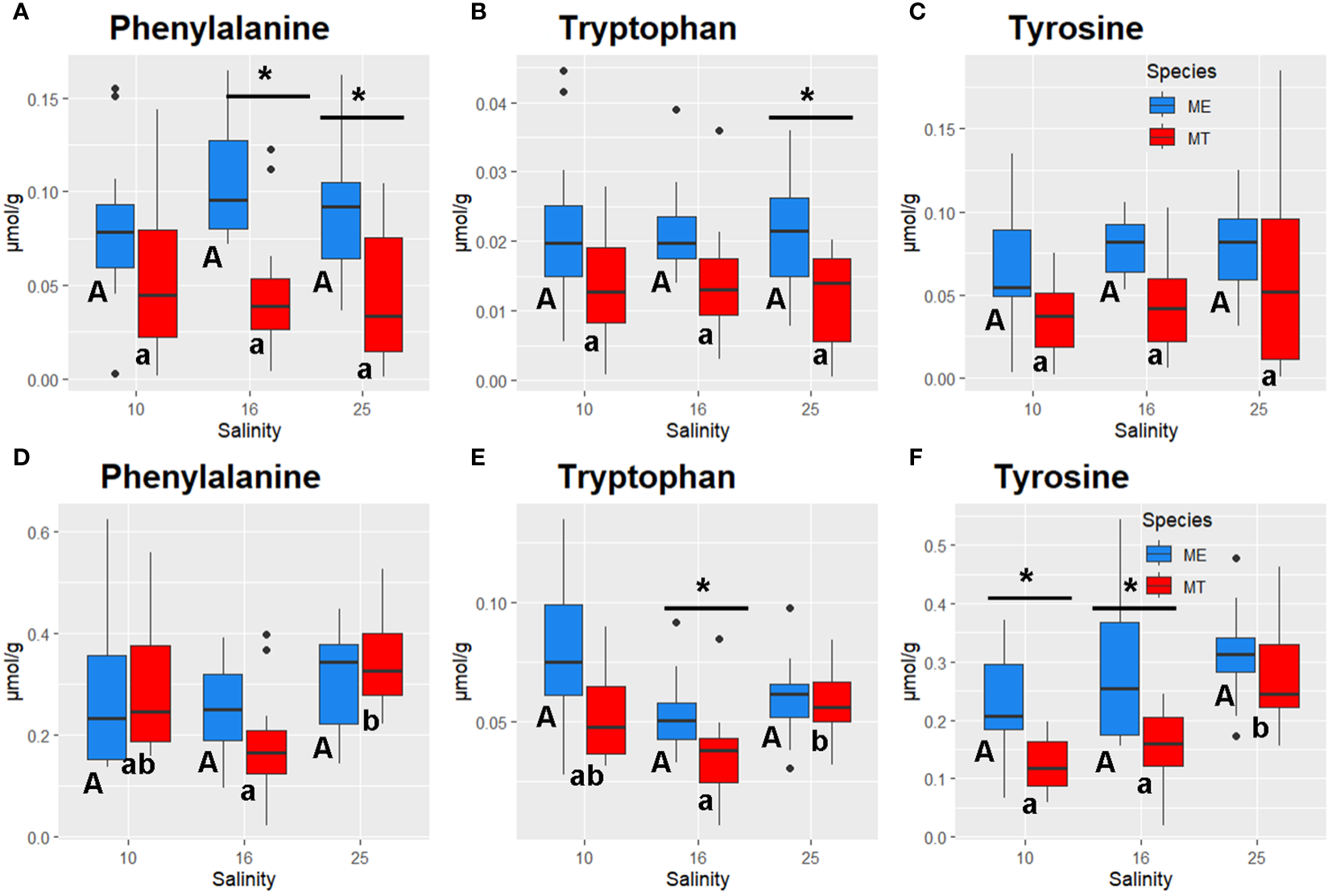 Salinity- and species-specific concentrations of aromatic amino acids in the tissues of the White Sea Mytilus spp. Significantly different values (P<0.05) in mussels at different salinities are indicated with different letters (upper case letters for M. edulis, and lower case letters for M. trossulus). Significant (P<0.05) difference between species within each salinity is indicated by horizontal bar with an asterisk. N = 10–15 (for sample sizes within each species- and salinity-specific group see Supplementary Tables 2 and 3). (A–C) gills; (D–F) – digestive gland. (A, D) – phenylalanine, (B, E) – tryptophan, (C, F) – tyrosine. ME, M. edulis; MT, M. trossulus.