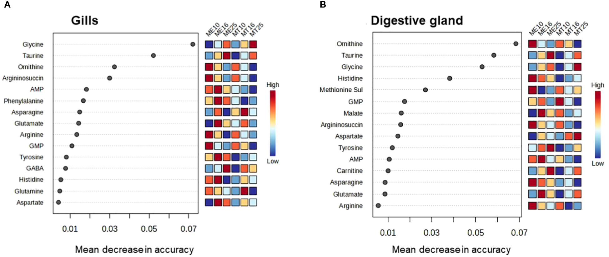 The out-of-bag (OOB) error based on 1000 permutations is 0.244 and 0.177 for the classifications of the metabolite profiles from the gill and the digestive gland, respectively.