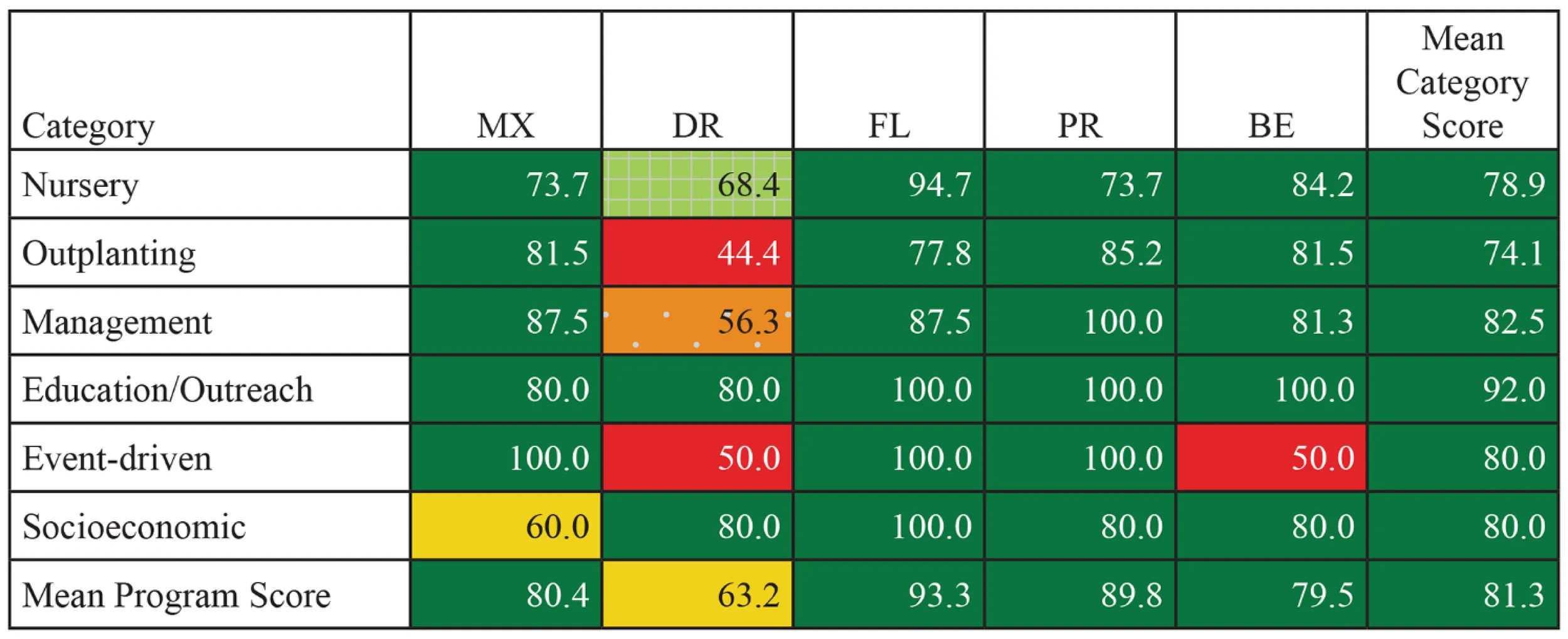 In 2021, the evaluation tool was distributed to five coral restoration programs, each with at least 15 years of field-based nursery and outplanting experience around the Caribbean, including Oceanus, A.C. in Quintana Roo, Mexico (MX); the Grupo Puntacana Foundation in Punta Cana, Dominican Republic (DR); the University of Miami (FL), in Miami, Florida, USA; Sociedad Ambiente Marino in Culebra, Puerto Rico, USA (PR); and Fragments of Hope in Placencia, Belize (BE). Each program was asked to provide one score for each metric regardless of the number of projects (e.g., nurseries, outplant sites, etc.) that have been or currently are managed by the program. Therefore, a metric would receive a score of “1” if all nurseries meet the criteria and a score of “0” if even one nursery did not meet the criteria for that metric. Additionally, programs were asked to provide scores for all metrics even if the metric was not an overarching goal of the program (e.g., education and outreach, enhancing recreational opportunities, etc.). While scoring a “0” for some metrics based on the whole rather than individual examples may reduce the overall score for the program, the intent within these case studies was to show the versatility of the tool and how it may be used to identify metrics that may require changes, adaptive management, or additional steps to increase success. Programs provided comments for potential reasons for scoring a metric as “0” (e.g., nurseries do not contain multiple species as funding is only available for one species, outplant mortality was high due to storm damage, a nursery has low genotypic diversity as the nursery was only recently installed). The scores were tallied for each category (e.g., nursery, outplanting, management, education/outreach, event driven restoration, and socioeconomic restoration) and averaged for a composite score for each case study (e.g., MX, DR, FL, PR, and BE). Each program used as a case study has been conducting coral restoration (propagation and outplanting) for at least 15 years, using similar methodologies for rearing and outplanting corals, and similar monitoring designs to evaluate their efforts. To account for potential differences in methodologies or coral restoration strategies, each program was asked to provide explanations of why they scored a metric as a “0” and those responses were considered by the authors when analyzing the composite score for each program.