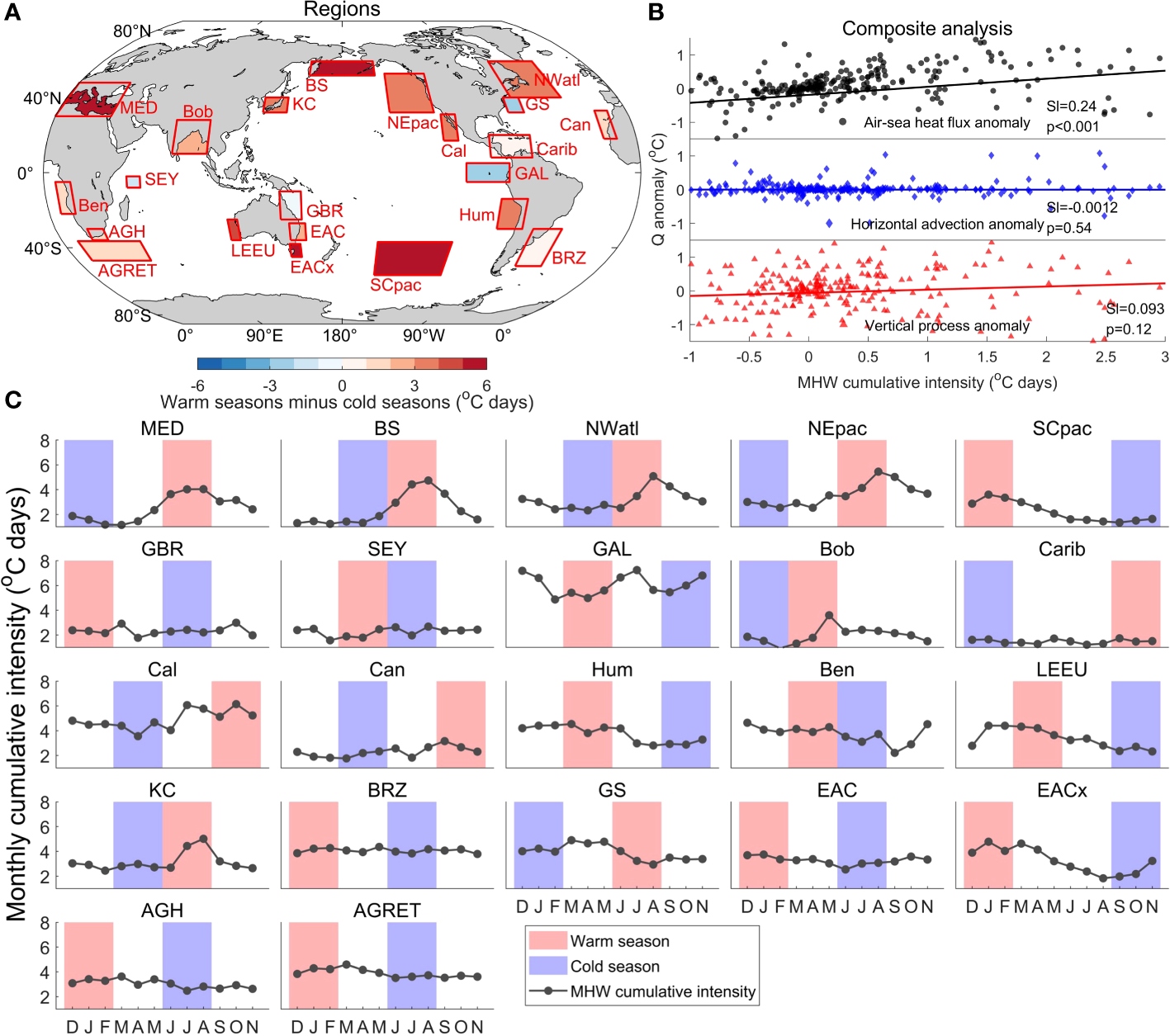 Seasonality of regional MHW cumulative intensity and primary physical processes related to interseasonal difference. Panel (A) shows the interseasonal difference (warm seasons minus cold seasons) in MHW cumulative intensity for 22 typical regions with strong MHWs (Holbrook et al., 2019). Panel (B) shows the result of the composite analysis, which illustrates the correlation between the interseasonal difference in three main physical processes from the heat budget equation and the interseasonal difference in MHW cumulative intensity. Each point indicates an annual interseasonal difference per region. Black dots represent air-sea heat flux anomalies, blue diamonds represent horizontal advection anomalies, and red triangles vertical process anomalies including mainly vertical entrainment and mixing. The Theil-Sen slope (Sl, unit: °C per °C days) and its p-value from the Mann-Kendall test represent the relative correlation among the three processes and corresponding significance. Panel (C) displays the multi-year average of monthly MHW cumulative intensity in the studied regions from 1982 to 2022. The interseasonal difference between warm and cold seasons in MHWs is heightened, particularly in the BS, NEpac, and EACx. Air-sea heat flux is identified as the dominant factor driving the peak of MHWs in the warm season and influencing interseasonal differences.