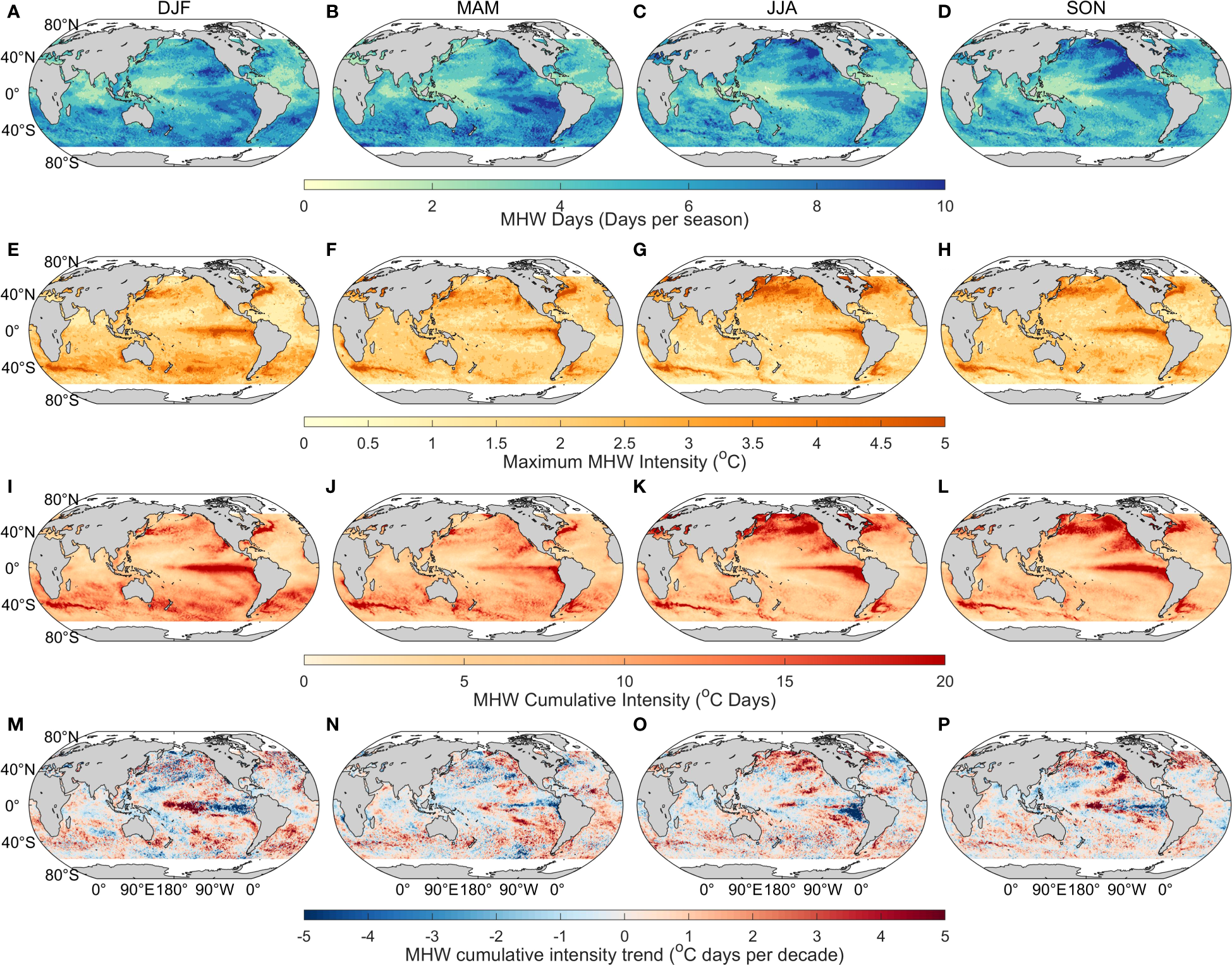 Characteristics of global MHWs in each season from 1982 to 2022. Panels show the seasonal distribution of MHW characteristics: total MHW days (A–D), maximum MHW intensity (E–H), MHW cumulative intensity (I–L), and trends in cumulative intensity using Sen’s slope (M–P), analyzed using the Theil-Sen slope. Red and blue colors in the trend panels (M–P) represent increasing and decreasing cumulative intensity, respectively. Seasons are presented from left to right as December-February (DJF), March-May (MAM), June-August (JJA), and September-November (SON). The results reveal a pronounced seasonality in MHWs, typically reaching their peak intensity during the local warm seasons in most regions. In addition, they also display large spatial heterogeneity, with areas experiencing high intensity showing a significant increasing trend.