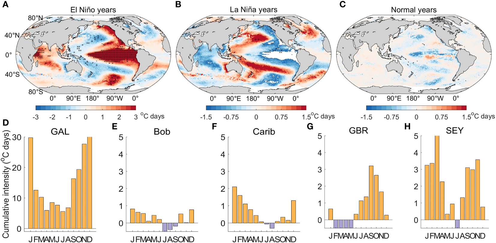 The effects of ENSO on MHWs. The monthly mean cumulative intensity (°C days) of MHWs is calculated by detrended SST, subtracting MHWs calculated from SSTs that are processed by both detrending and removing linear Niño3.4 index. Panels (A–C) show a synthetic average of different typical years: (A) El Niño years, (B) La Niña years, and (C) normal years, as detailed in the methods. Black dots indicate a statistically significant effect of ENSO on MHWs, as determined by a t-test with p-values less than 0.05. Panels (D–H) show the effects of ENSO in different seasons in equatorial regions: Galápagos (GAL), Bay of Bengal (Bob), Caribbean Sea (Carib), Great Barrier Reef (GBR), and Seychelles (SEY). Yellow bars indicate a positive effect of ENSO on MHWs, while purple bars mean inhibition. ENSO significantly exacerbates MHW cumulative intensity in the equatorial regions, especially during winter in El Niño years, serving as the primary driver for the strong MHWs from December to February.