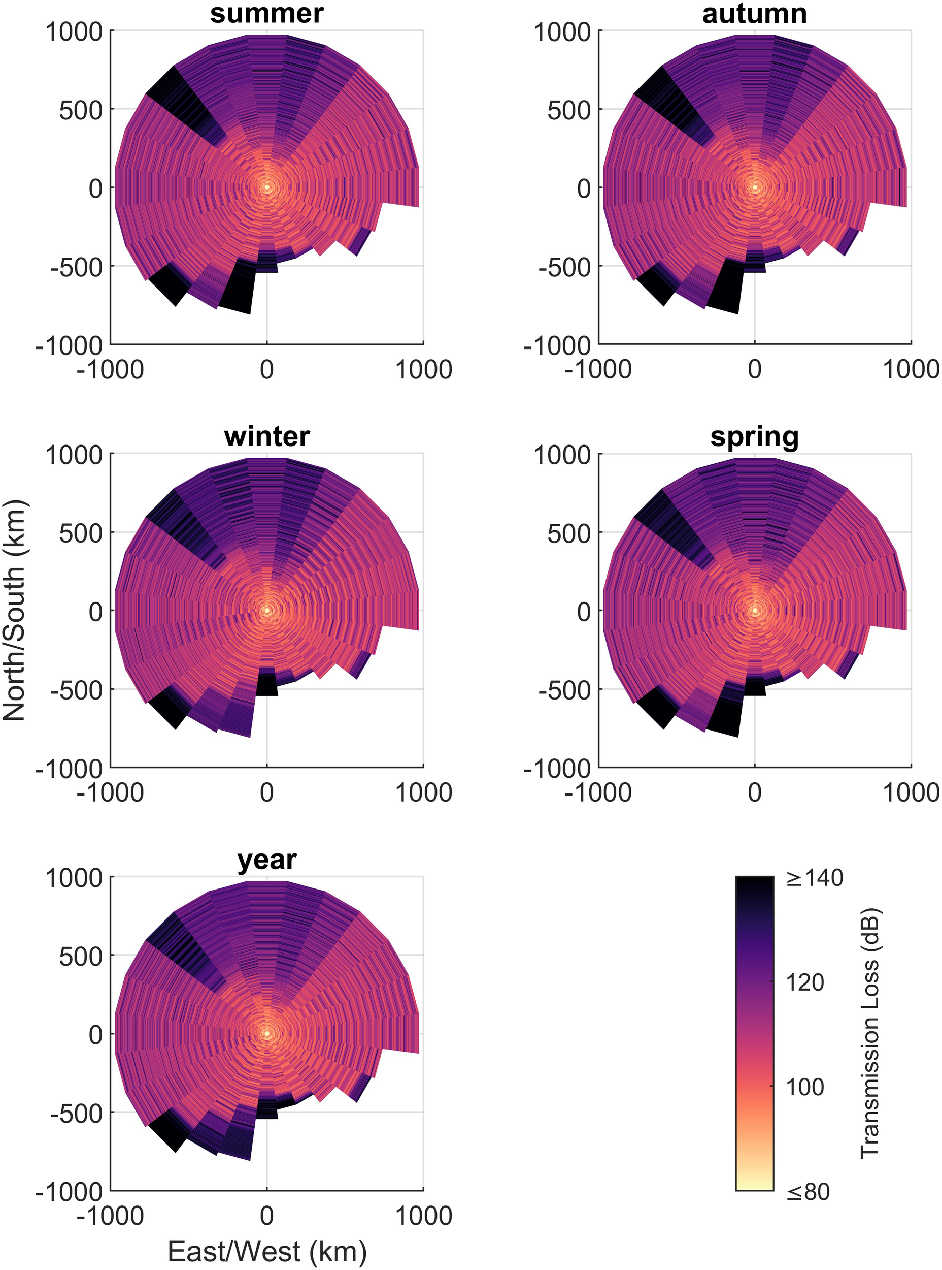 Additionally, there is scope for improvement in estimation of TL, particularly via populating TL models with more accurate and higher-resolution environmental parameters, and accounting for uncertainty in model inputs where necessary. For example: higher-resolution and more accurate bathymetry than etopo1 could be used where available. Similarly, more accurate local SSPs than those derived from decadal & broad-spatial averages could also be used where available. Ideally, this would involve using in-situ data from argos floats and scientific surveys that occur in the vicinity of the monitoring sites (spatially and in time). Furthermore, it might also include modifications to vary the SSP spatially along each radial (in the same manner as bathymetry). And lastly, our assumption of homogenous seabed geoacoustics could be improved upon. In the Antarctic, little is known about density and sound-speed of the seabed at any location, but once measures are made at a location, these are likely to remain stable for a long time, so such data do have good potential for longevity/legacy, as well as retrospective re-analysis of call density should they become available. Such analysis would be important when comparing across different sites, but is less important for analyses comparing different time periods at a single site (like our seasonal analysis here) since these properties are not likely to vary much over time.