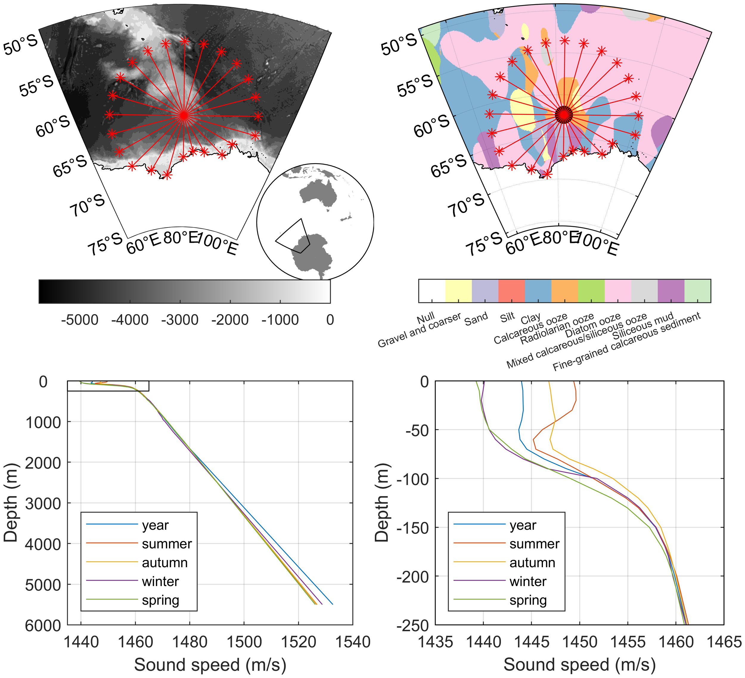 Maps of recording location (red circle) and transects used to estimate probability of detection in the study area (red lines). Top Left: bathymetry in m from etopo1 (Amante and Eakins, 2009). Top Right: sediment type from the Census of Seabed Sediments (Dutkiewicz et al., 2015) illustrating that the most common sediments are “clay” and “diatom ooze.” Bottom: seasonal sound-speed profiles at the recording location as a function of depth derived salinity and temperatures from the World Ocean Atlas 2018 (Boyer et al., 2018). Bottom left panel shows full depth range, while the bottom right panel shows the same information, but focused on the first 250 m to better illustrate the details of this region.