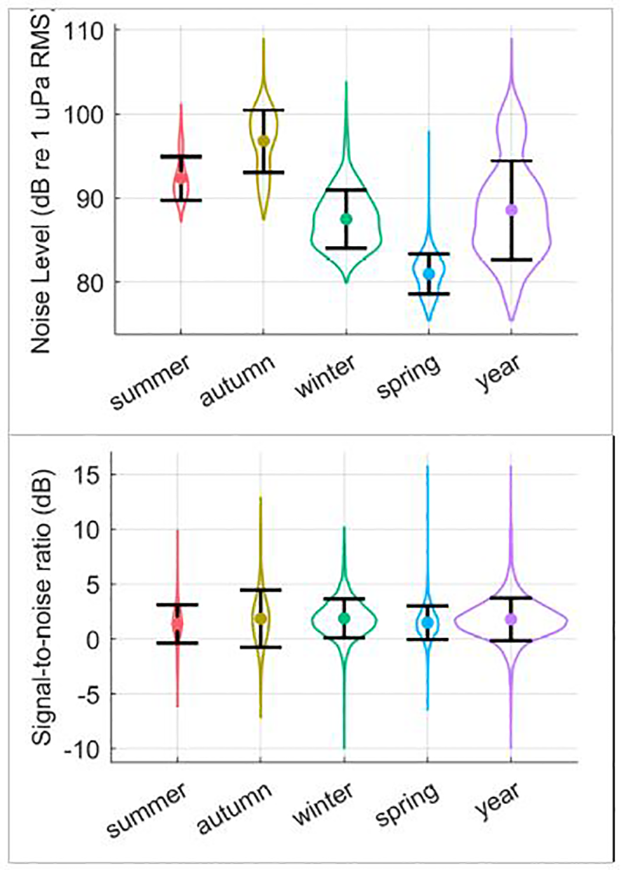 Noise levels showed strong differences over time yielding differences in seasonal mean NLs and respective standard deviations (Table 1; Figure 5). These seasonal differences in NL are in accord with what would be expected due to the seasonal effects of Antarctic sea-ice on underwater noise levels (Miller et al., 2016; Menze et al., 2017; Shabangu et al., 2020; Yun et al., 2021). However, the distribution of SNR of the annotated calls was relatively consistent over time (Figure 5). In contrast to NL, the SNR-detection functions for autumn, winter, and spring were all fairly similar to each other, but different than that for summer (Figure 2). In particular, the SNR-detection function for summer had a shallower slope than other seasons, and substantially wider confidence intervals.