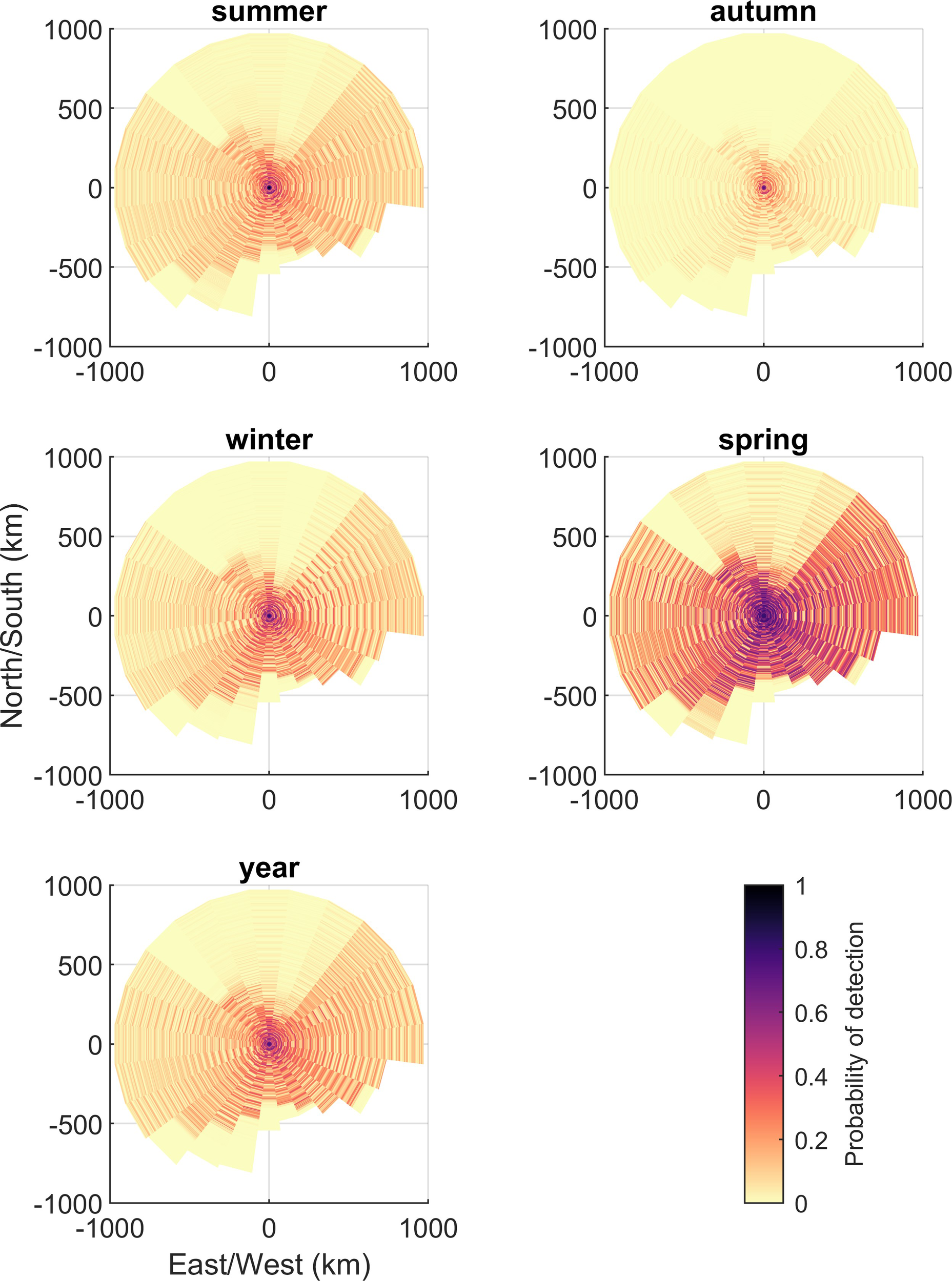 The probability of detection produced by the Monte Carlo simulation decreased to a negligible value at the adopted maximum range of 980 km (Figure 3). Following the pattern set out by NL, the probability of detection within the study area, , varied substantially across the different time periods (Figure 6; Table 1). The lowest occurred in autumn and the highest values were in spring and, as would be expected, these were inversely correlated with NL.