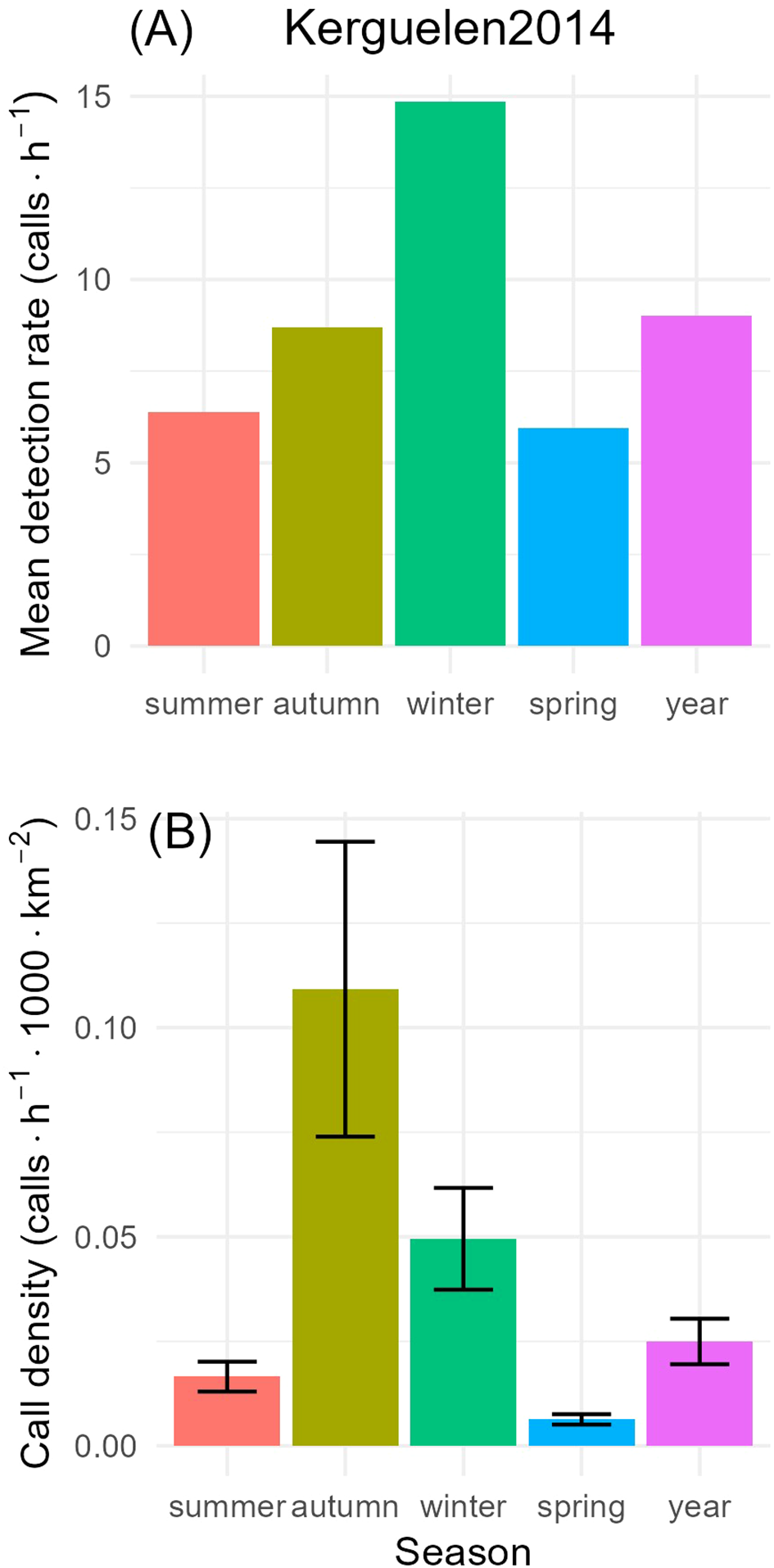 Plotting our seasonal call densities with confidence intervals reveals differences across seasons, without overlap in 95% confidence intervals. Furthermore, the seasonal pattern of call densities that we found was different from that of detection rate. Detection rate showed a maximum in the winter, with middling detection rates for summer, autumn, and spring that were all relatively indiscernible (within 2.5 in units of calls/h) from each other since they were confounded by greatly varying noise levels and thus . Our call densities peaked at a maximum in autumn, falling to a clear minimum in spring. Thus, our data demonstrate that there is a quantifiable seasonal difference in call density, and that this difference was driven by some combination of seasonal changes in ABW density, and/or acoustic behaviour.