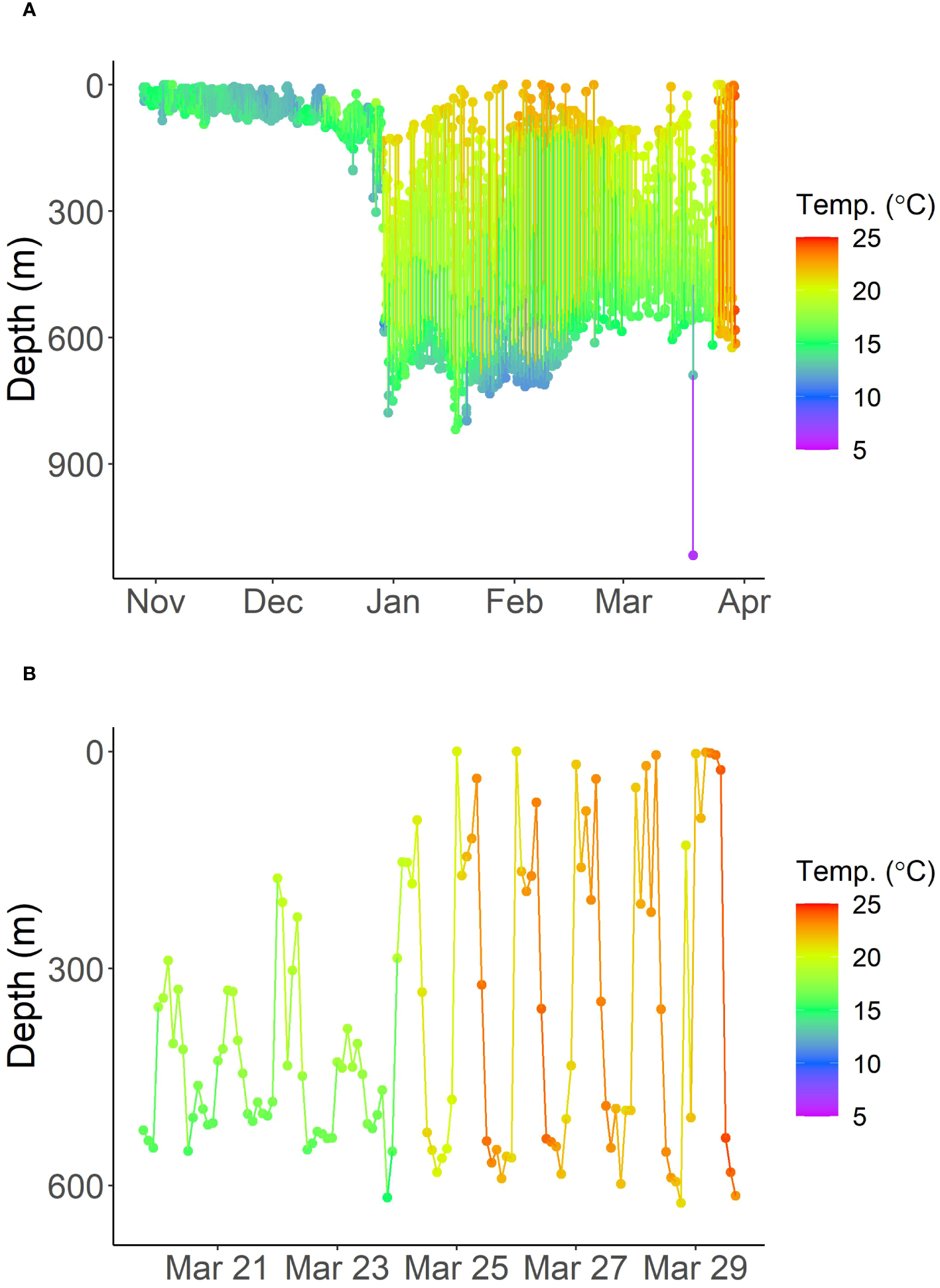 Depth and temperature time-series over the entire deployment (A) and the last week before pop-off (B) for the tagged porbeagle.