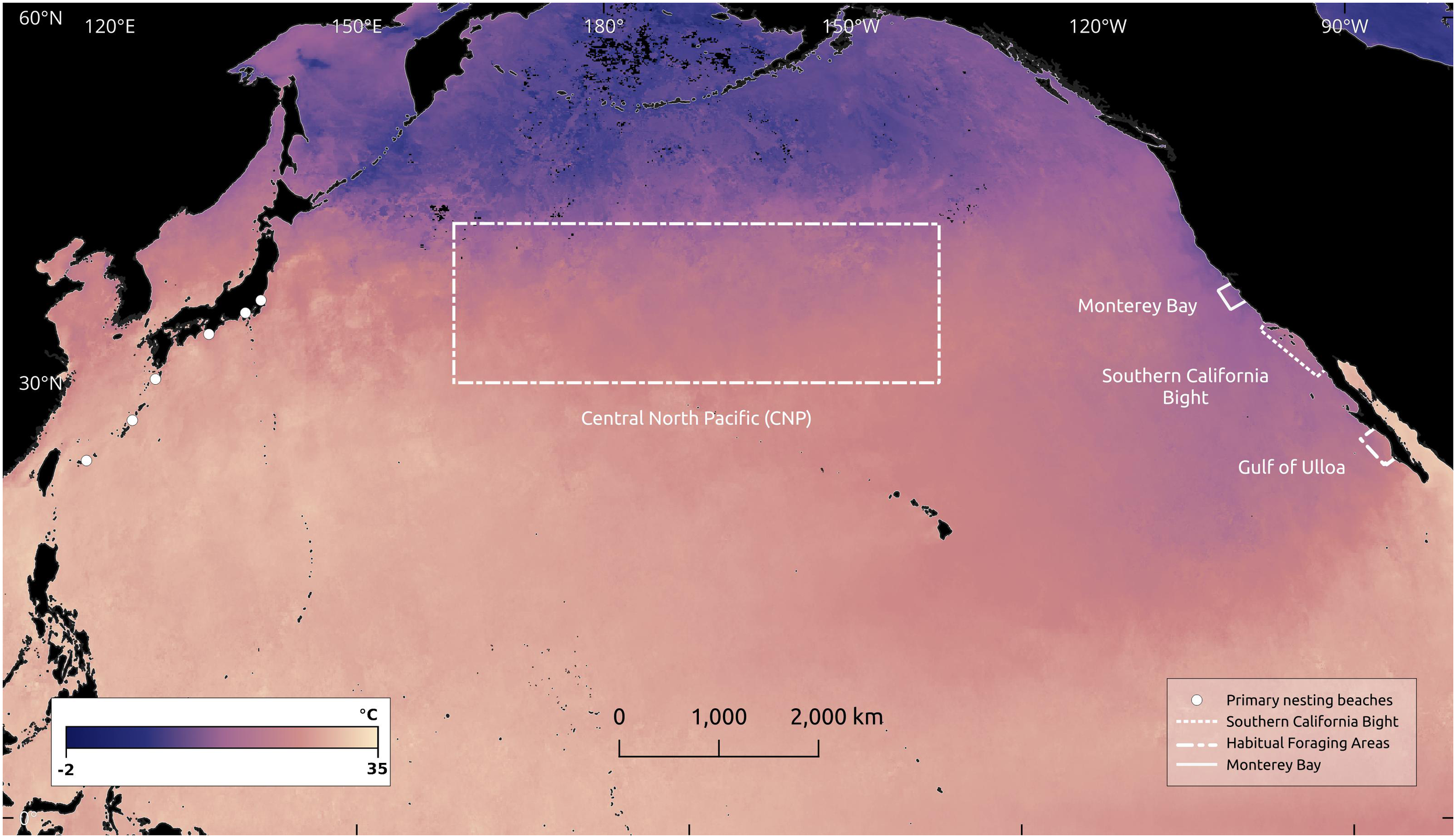 Locations of loggerhead sea turtle (Caretta caretta) primary nesting beaches (white dots) and foraging habitats (dashed-dot line), along with Monterey Bay (solid line) and the Southern California Bight (dotted line). Sea Surface Temperature (SST) for July, 2023 is shown at 0.1° resolution. Imagery processed by the NASA Earth Observations (NEO) team in collaboration with Gene Feldman and Norman Kuring, NASA OceanColor Group (NASA Earth Observatory, 2023).